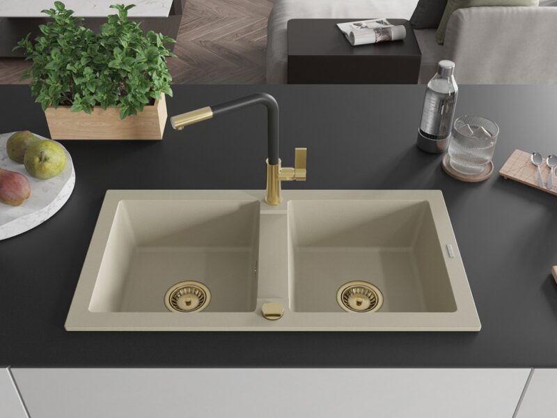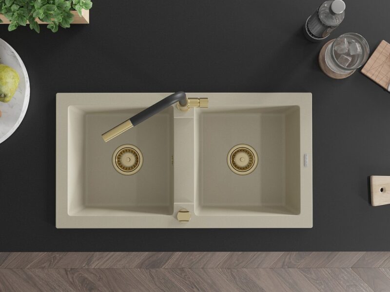 Technické dáta: drez: Rozmer: 820 x 436 x 161 mm Hĺbka komory: 151 mm Rozmery komory: 356×336 mm Priemer odtoku: ø90 mm Typ: 2-komorový Typ: Zapustené do pracovnej dosky Farba béžová Povrchová úprava sifónu: zlatá Materiál: žula (80% žulové kamenivo, 20% živice) Prepadový otvor: Áno Otvory: (batérie, automatické) 2 Vysoká odolnosť proti poškriabaniu a zmene farby Odolnosť proti tepelným šokom Ľahko čistiteľný povrch kuchynská batéria: Materiál: mosadz Farba: Zlatá/Čierna Hlava: Keramická Prevzdušňovač: Áno Typ: Jedna páka Rozsah výtoku: 245 mm Výška batérie: 307 mm(GT) Ean: 5905315057570