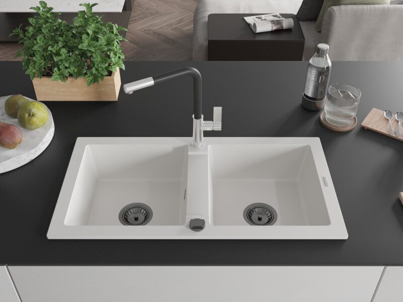 Technické dáta: drez: Rozmer: 820 x 436 x 161 mm Hĺbka komory: 151 mm Rozmery komory: 356×336 mm Priemer odtoku: ø90 mm Typ: 2-komorový Typ: Zapustené do pracovnej dosky biela farba Povrchová úprava sifónu: čierna Materiál: žula (80% žulové kamenivo, 20% živice) Prepadový otvor: Áno Otvory: (batérie, automatické) 2 Vysoká odolnosť proti poškriabaniu a zmene farby Odolnosť proti tepelným šokom Ľahko čistiteľný povrch kuchynská batéria: Materiál: mosadz Farba: chróm/čierna Hlava: Keramická Prevzdušňovač: Áno Typ: Jedna páka Rozsah výtoku: 245 mm Výška batérie: 307 mm(GT) Ean: 5905315057495