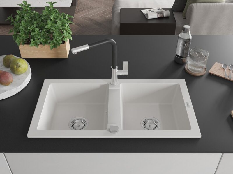 Technické dáta: drez: Rozmer: 820 x 436 x 161 mm Hĺbka komory: 151 mm Rozmery komory: 356×336 mm Priemer odtoku: ø90 mm Typ: 2-komorový Typ: Zapustené do pracovnej dosky biela farba Povrchová úprava sifónu: Chrome Materiál: žula (80% žulové kamenivo, 20% živice) Prepadový otvor: Áno Otvory: (batérie, automatické) 2 Vysoká odolnosť proti poškriabaniu a zmene farby Odolnosť proti tepelným šokom Ľahko čistiteľný povrch kuchynská batéria: Materiál: mosadz Farba: chróm/čierna Hlava: Keramická Prevzdušňovač: Áno Typ: Jedna páka Rozsah výtoku: 245 mm Výška batérie: 307 mm(GT) Ean: 5905315057488