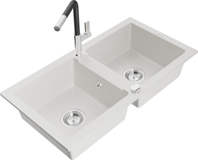 MEXEN/S MEXEN/S – Mario granitový drez 2-bowl vrátane batérie Flora, biela 6504-20-670401-07