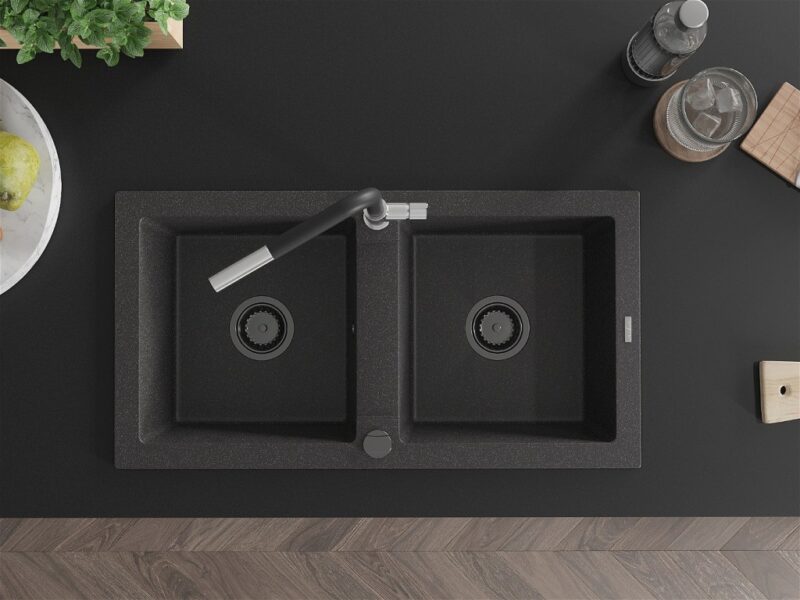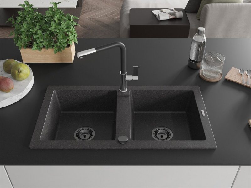 Technické dáta: drez: Rozmer: 820 x 436 x 161 mm Hĺbka komory: 151 mm Rozmery komory: 356×336 mm Priemer odtoku: ø90 mm Typ: 2-komorový Typ: Zapustené do pracovnej dosky Farba: Škvrnitá čierna Povrchová úprava sifónu: čierna Materiál: žula (80% žulové kamenivo, 20% živice) Prepadový otvor: Áno Otvory: (batérie, automatické) 2 Vysoká odolnosť proti poškriabaniu a zmene farby Odolnosť proti tepelným šokom Ľahko čistiteľný povrch kuchynská batéria: Materiál: mosadz Farba: chróm/čierna Hlava: Keramická Prevzdušňovač: Áno Typ: Jedna páka Rozsah výtoku: 245 mm Výška batérie: 307 mm(GT) Ean: 5905315057815