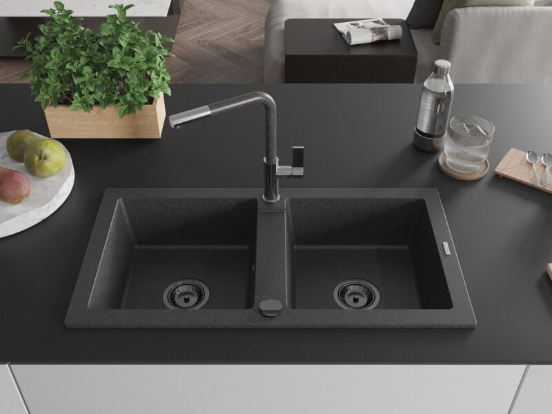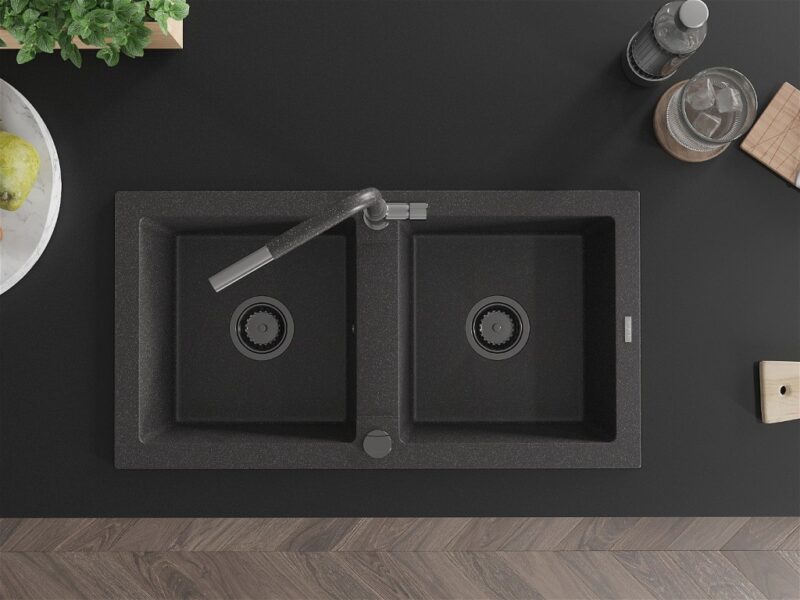 Technické dáta: drez: Rozmer: 820 x 436 x 161 mm Hĺbka komory: 151 mm Rozmery komory: 356×336 mm Priemer odtoku: ø90 mm Typ: 2-komorový Typ: Zapustené do pracovnej dosky Farba: Škvrnitá čierna Povrchová úprava sifónu: čierna Materiál: žula (80% žulové kamenivo, 20% živice) Prepadový otvor: Áno Otvory: (batérie, automatické) 2 Vysoká odolnosť proti poškriabaniu a zmene farby Odolnosť proti tepelným šokom Ľahko čistiteľný povrch kuchynská batéria: Materiál: mosadz Farba: chróm/čierna škvrnitá Hlava: Keramická Prevzdušňovač: Áno Typ: Jedna páka Rozsah výtoku: 245 mm Výška batérie: 307 mm(GT) Ean: 5905315057839