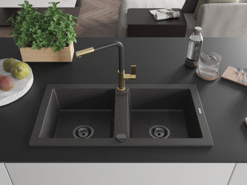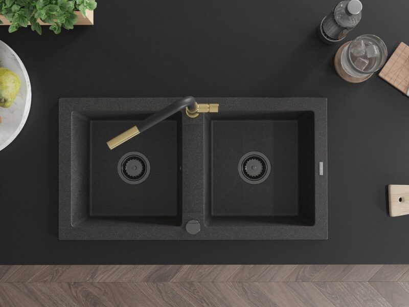 Technické dáta: drez: Rozmer: 820 x 436 x 161 mm Hĺbka komory: 151 mm Rozmery komory: 356×336 mm Priemer odtoku: ø90 mm Typ: 2-komorový Typ: Zapustené do pracovnej dosky Farba: Škvrnitá čierna Povrchová úprava sifónu: čierna Materiál: žula (80% žulové kamenivo, 20% živice) Prepadový otvor: Áno Otvory: (batérie, automatické) 2 Vysoká odolnosť proti poškriabaniu a zmene farby Odolnosť proti tepelným šokom Ľahko čistiteľný povrch kuchynská batéria: Materiál: mosadz Farba: Zlatá/Čierna Hlava: Keramická Prevzdušňovač: Áno Typ: Jedna páka Rozsah výtoku: 245 mm Výška batérie: 307 mm(GT) Ean: 5905315057853