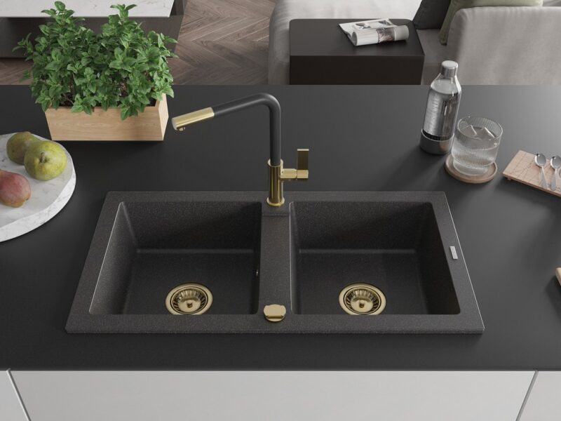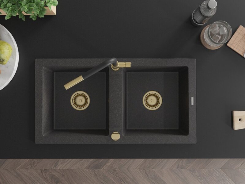 Technické dáta: drez: Rozmer: 820 x 436 x 161 mm Hĺbka komory: 151 mm Rozmery komory: 356×336 mm Priemer odtoku: ø90 mm Typ: 2-komorový Typ: Zapustené do pracovnej dosky Farba: Škvrnitá čierna Povrchová úprava sifónu: zlatá Materiál: žula (80% žulové kamenivo, 20% živice) Prepadový otvor: Áno Otvory: (batérie, automatické) 2 Vysoká odolnosť proti poškriabaniu a zmene farby Odolnosť proti tepelným šokom Ľahko čistiteľný povrch kuchynská batéria: Materiál: mosadz Farba: Zlatá/Čierna Hlava: Keramická Prevzdušňovač: Áno Typ: Jedna páka Rozsah výtoku: 245 mm Výška batérie: 307 mm(GT) Ean: 5905315057846