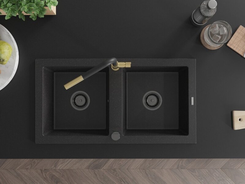 Technické dáta: drez: Rozmer: 820 x 436 x 161 mm Hĺbka komory: 151 mm Rozmery komory: 356×336 mm Priemer odtoku: ø90 mm Typ: 2-komorový Typ: Zapustené do pracovnej dosky Farba: čierna/strieborná metalíza Povrchová úprava sifónu: čierna Materiál: žula (80% žulové kamenivo, 20% živice) Prepadový otvor: Áno Otvory: (batérie, automatické) 2 Vysoká odolnosť proti poškriabaniu a zmene farby Odolnosť proti tepelným šokom Ľahko čistiteľný povrch kuchynská batéria: Materiál: mosadz Farba: Zlatá/Čierna Hlava: Keramická Prevzdušňovač: Áno Typ: Jedna páka Rozsah výtoku: 245 mm Výška batérie: 307 mm(GT) Ean: 5905315057716
