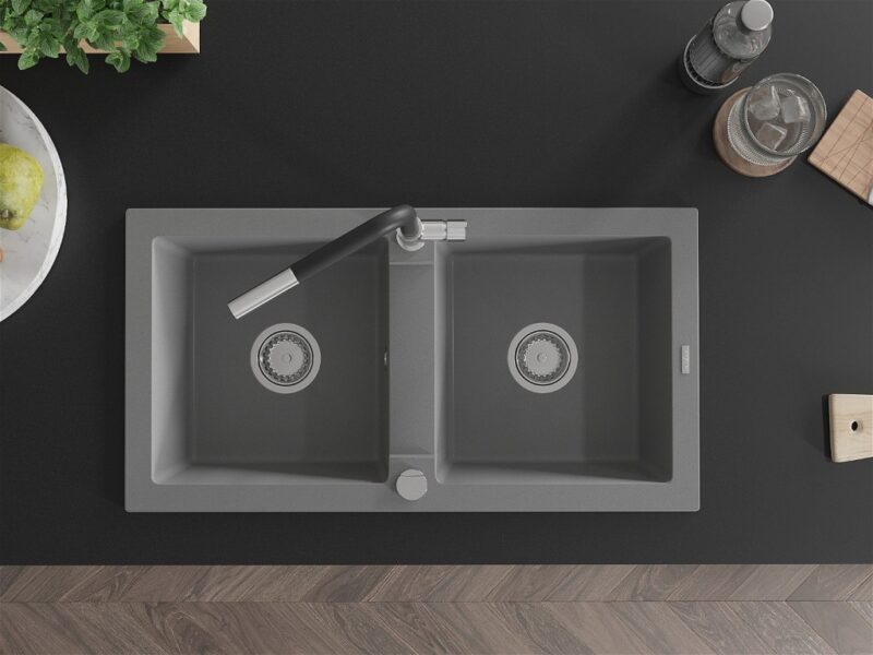 MEXEN/S MEXEN/S – Mario granitový drez 2-bowl vrátane batérie Flora, šedá 6504-71-670401-07