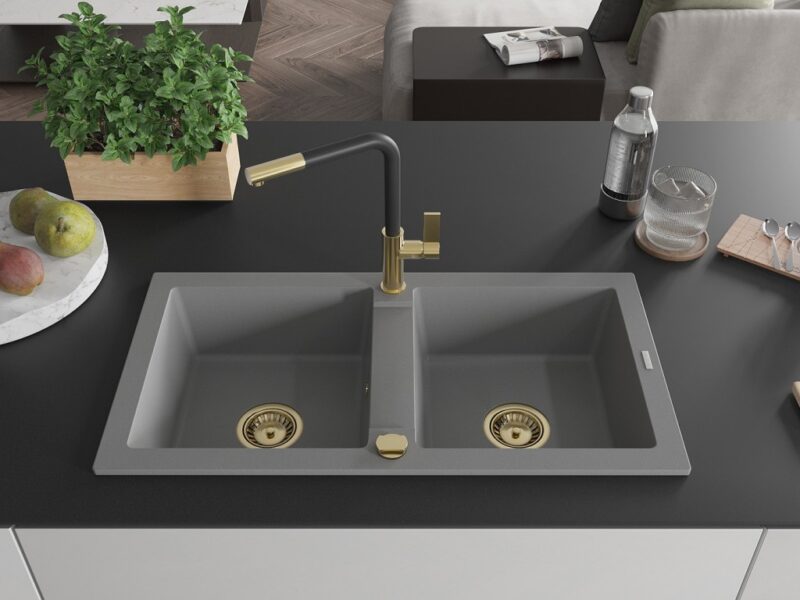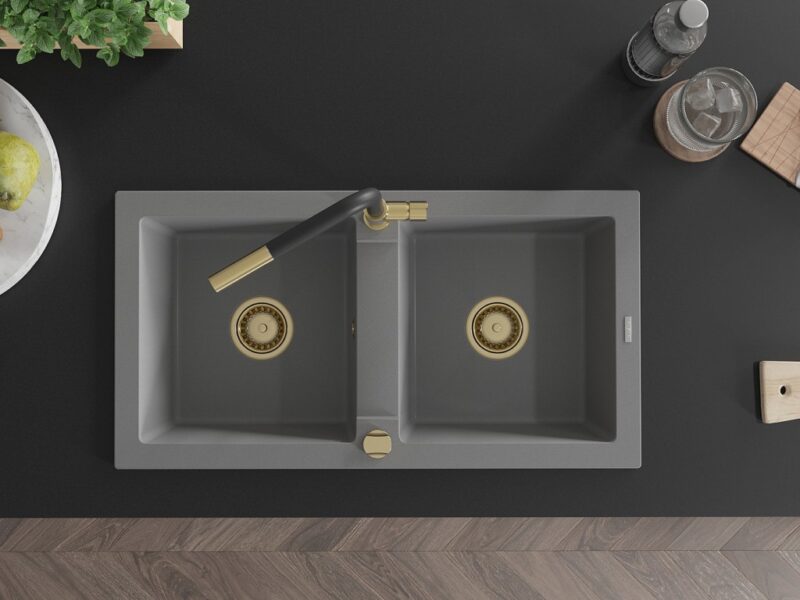 Technické dáta: drez: Rozmer: 820 x 436 x 161 mm Hĺbka komory: 151 mm Rozmery komory: 356×336 mm Priemer odtoku: ø90 mm Typ: 2-komorový Typ: Zapustené do pracovnej dosky Šedá farba Povrchová úprava sifónu: zlatá Materiál: žula (80% žulové kamenivo, 20% živice) Prepadový otvor: Áno Otvory: (batérie, automatické) 2 Vysoká odolnosť proti poškriabaniu a zmene farby Odolnosť proti tepelným šokom Ľahko čistiteľný povrch kuchynská batéria: Materiál: mosadz Farba: Zlatá/Čierna Hlava: Keramická Prevzdušňovač: Áno Typ: Jedna páka Rozsah výtoku: 245 mm Výška batérie: 307 mm(GT) Ean: 5905315057648