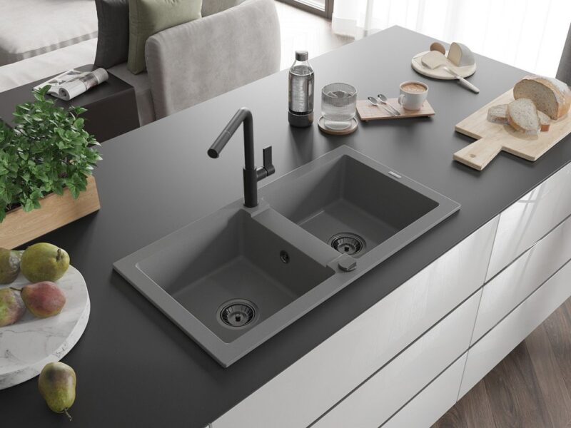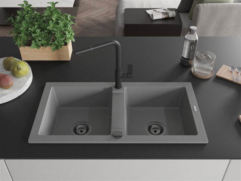 Technické dáta: drez: Rozmer: 820 x 436 x 161 mm Hĺbka komory: 151 mm Rozmery komory: 356×336 mm Priemer odtoku: ø90 mm Typ: 2-komorový Typ: Zapustené do pracovnej dosky Šedá farba Povrchová úprava sifónu: čierna Materiál: žula (80% žulové kamenivo, 20% živice) Prepadový otvor: Áno Otvory: (batérie, automatické) 2 Vysoká odolnosť proti poškriabaniu a zmene farby Odolnosť proti tepelným šokom Ľahko čistiteľný povrch kuchynská batéria: Materiál: mosadz Čierna farba Hlava: Keramická Prevzdušňovač: Áno Typ: Jedna páka Rozsah výtoku: 245 mm Výška batérie: 307 mm(GT) Ean: 5905315057662
