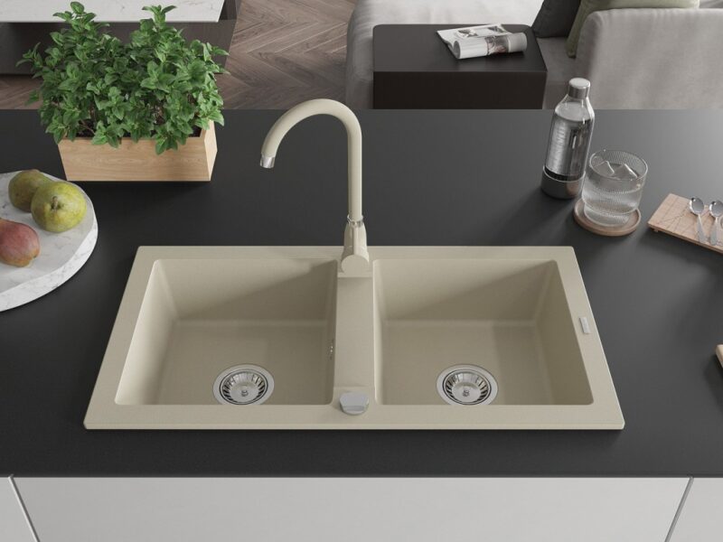 Technické dáta: drez: Rozmer: 820 x 436 x 161 mm Hĺbka komory: 151 mm Rozmery komory: 356×336 mm Priemer odtoku: ø90 mm Typ: 2-komorový Typ: Zapustené do pracovnej dosky Farba béžová Povrchová úprava sifónu: Chrome Materiál: žula (80% žulové kamenivo, 20% živice) Prepadový otvor: Áno Otvory: (batérie, automatické) 2 Vysoká odolnosť proti poškriabaniu a zmene farby Odolnosť proti tepelným šokom Ľahko čistiteľný povrch kuchynská batéria: Materiál: mosadz Farba béžová Hlava: Keramická Prevzdušňovač: Áno Výška batérie: 335 mm Rozsah výtoku: 180 mm(GT) Ean: 5907709189430