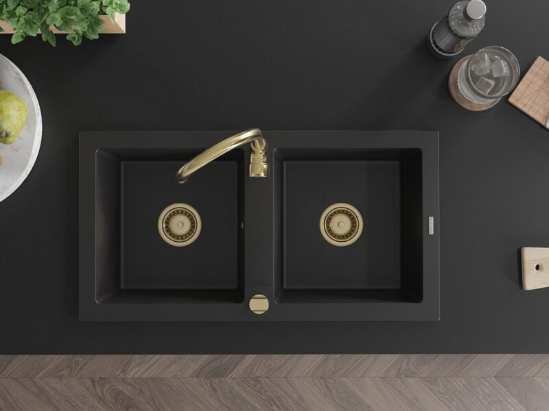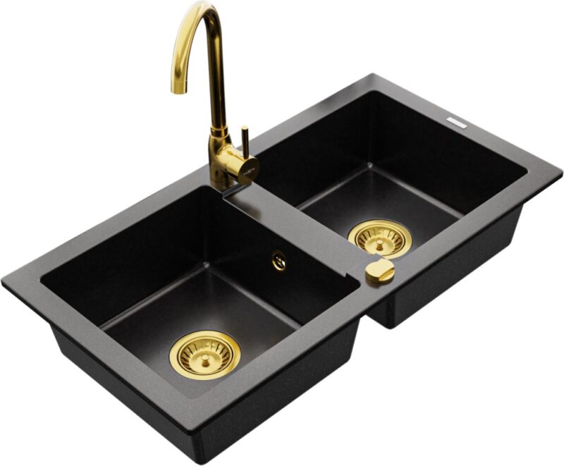 Technické dáta: drez: Rozmer: 820 x 436 x 161 mm Hĺbka komory: 151 mm Rozmery komory: 356×336 mm Priemer odtoku: ø90 mm Typ: 2-komorový Typ: Zapustené do pracovnej dosky Čierna farba Povrchová úprava sifónu: zlatá Materiál: žula (80% žulové kamenivo, 20% živice) Prepadový otvor: Áno Otvory: (batérie, automatické) 2 Vysoká odolnosť proti poškriabaniu a zmene farby Odolnosť proti tepelným šokom Ľahko čistiteľný povrch kuchynská batéria: Materiál: mosadz Farba: Zlatá Hlava: Keramická Prevzdušňovač: Áno Výška batérie: 335 mm Rozsah výtoku: 180 mm(GT) Ean: 5907709189539