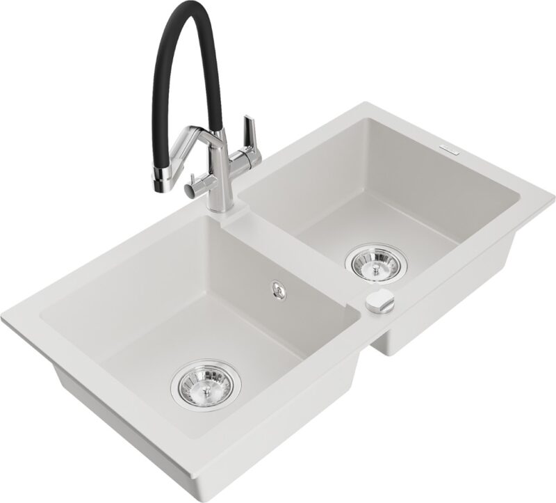 Technické dáta: drez: Rozmer: 820 x 436 x 161 mm Hĺbka komory: 151 mm Rozmery komory: 356×336 mm Priemer odtoku: ø90 mm Typ: 2-komorový Typ: Zapustené do pracovnej dosky biela farba Povrchová úprava sifónu: Chrome Materiál: žula (80% žulové kamenivo, 20% živice) Prepadový otvor: Áno Otvory: (batérie, automatické) 2 Vysoká odolnosť proti poškriabaniu a zmene farby Odolnosť proti tepelným šokom Ľahko čistiteľný povrch kuchynská batéria: Materiál: mosadz Povrchová úprava: chróm / čierna Hlavy: Keramické Prevzdušňovač: Áno Typ hubica: Flexibilný s mosadzným držiakom Rozsah výtoku: 260 mm Výška: 405 mm Typ: Dve rukoväte Dvojhlavá batéria s prídavným filtrom na pitnú vodu(GT) Ean: 5905315045577