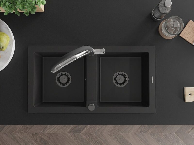 Technické dáta: drez: Rozmer: 820 x 436 x 161 mm Hĺbka komory: 151 mm Rozmery komory: 356×336 mm Priemer odtoku: ø90 mm Typ: 2-komorový Typ: Zapustené do pracovnej dosky Čierna farba Povrchová úprava sifónu: čierna Materiál: žula (80% žulové kamenivo, 20% živice) Prepadový otvor: Áno Otvory: (batérie, automatické) 2 Vysoká odolnosť proti poškriabaniu a zmene farby Odolnosť proti tepelným šokom Ľahko čistiteľný povrch kuchynská batéria: Materiál: mosadz Farba: chróm/čierna Hlavy: Keramické Prevzdušňovač: Áno Typ hubica: Flexibilný s mosadzným držiakom Rozsah výtoku: 260 mm Výška: 405 mm Typ: Dve rukoväte Dvojhlavá batéria s prídavným filtrom na pitnú vodu(GT) Ean: 5905315047793