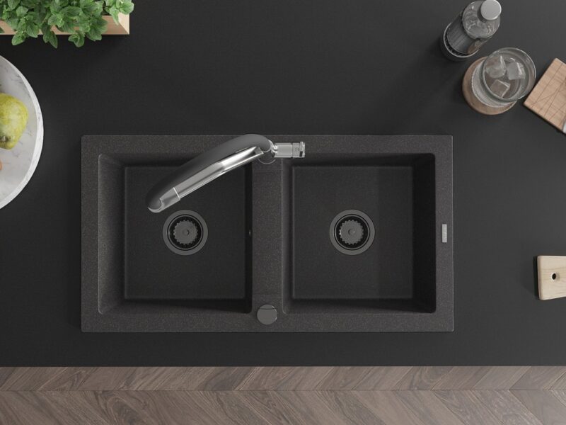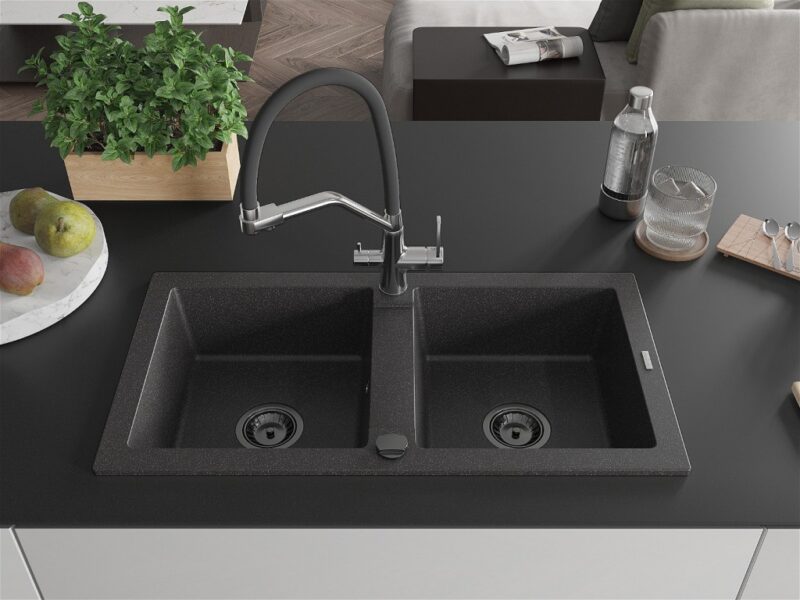 Technické dáta: drez: Rozmer: 820 x 436 x 161 mm Hĺbka komory: 151 mm Rozmery komory: 356×336 mm Priemer odtoku: ø90 mm Typ: 2-komorový Typ: Zapustené do pracovnej dosky Farba: Škvrnitá čierna Povrchová úprava sifónu: čierna Materiál: žula (80% žulové kamenivo, 20% živice) Prepadový otvor: Áno Otvory: (batérie, automatické) 2 Vysoká odolnosť proti poškriabaniu a zmene farby Odolnosť proti tepelným šokom Ľahko čistiteľný povrch kuchynská batéria: Materiál: mosadz Farba: chróm/čierna Hlavy: Keramické Prevzdušňovač: Áno Typ hubica: Flexibilný s mosadzným držiakom Rozsah výtoku: 260 mm Výška: 405 mm Typ: Dve rukoväte Dvojhlavá batéria s prídavným filtrom na pitnú vodu(GT) Ean: 5905315047434