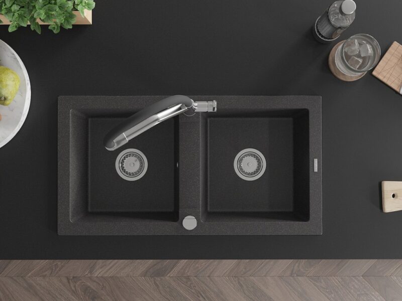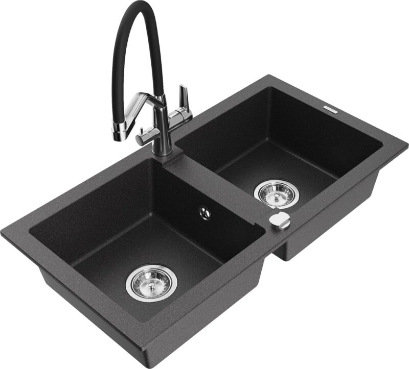 Technické dáta: drez: Rozmer: 820 x 436 x 161 mm Hĺbka komory: 151 mm Rozmery komory: 356×336 mm Priemer odtoku: ø90 mm Typ: 2-komorový Typ: Zapustené do pracovnej dosky Farba: Škvrnitá čierna Povrchová úprava sifónu: Chrome Materiál: žula (80% žulové kamenivo, 20% živice) Prepadový otvor: Áno Otvory: (batérie, automatické) 2 Vysoká odolnosť proti poškriabaniu a zmene farby Odolnosť proti tepelným šokom Ľahko čistiteľný povrch kuchynská batéria: Materiál: mosadz Farba: chróm/čierna Hlavy: Keramické Prevzdušňovač: Áno Typ hubica: Flexibilný s mosadzným držiakom Rozsah výtoku: 260 mm Výška: 405 mm Typ: Dve rukoväte Dvojhlavá batéria s prídavným filtrom na pitnú vodu(GT) Ean: 5905315047373