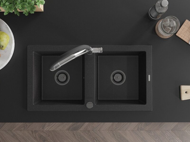 Technické dáta: drez: Rozmer: 820 x 436 x 161 mm Hĺbka komory: 151 mm Rozmery komory: 356×336 mm Priemer odtoku: ø90 mm Typ: 2-komorový Typ: Zapustené do pracovnej dosky Farba: čierna/strieborná metalíza Povrchová úprava sifónu: čierna Materiál: žula (80% žulové kamenivo, 20% živice) Prepadový otvor: Áno Otvory: (batérie, automatické) 2 Vysoká odolnosť proti poškriabaniu a zmene farby Odolnosť proti tepelným šokom Ľahko čistiteľný povrch kuchynská batéria: Materiál: mosadz Farba: chróm/čierna Hlavy: Keramické Prevzdušňovač: Áno Typ hubica: Flexibilný s mosadzným držiakom Rozsah výtoku: 260 mm Výška: 405 mm Typ: Dve rukoväte Dvojhlavá batéria s prídavným filtrom na pitnú vodu(GT) Ean: 5905315046772