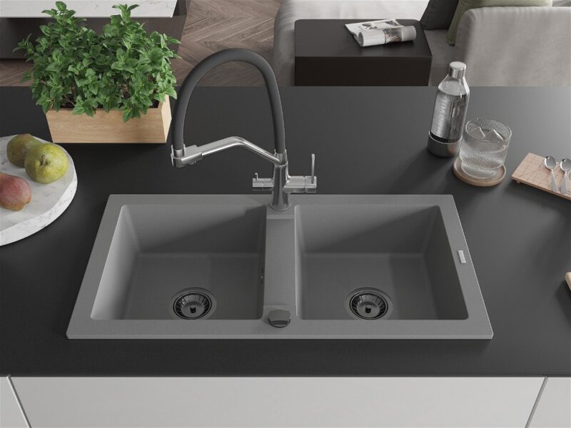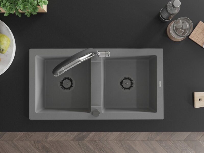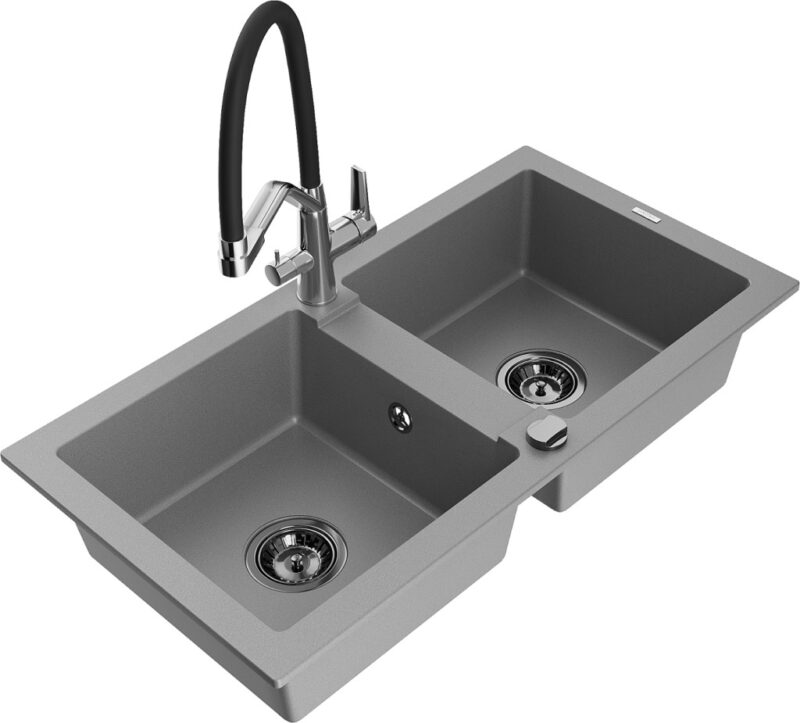 Technické dáta: drez: Rozmer: 820 x 436 x 161 mm Hĺbka komory: 151 mm Rozmery komory: 356×336 mm Priemer odtoku: ø90 mm Typ: 2-komorový Typ: Zapustené do pracovnej dosky Šedá farba Povrchová úprava sifónu: čierna Materiál: žula (80% žulové kamenivo, 20% živice) Prepadový otvor: Áno Otvory: (batérie, automatické) 2 Vysoká odolnosť proti poškriabaniu a zmene farby Odolnosť proti tepelným šokom Ľahko čistiteľný povrch kuchynská batéria: Materiál: mosadz Farba: chróm/čierna Hlavy: Keramické Prevzdušňovač: Áno Typ hubica: Flexibilný s mosadzným držiakom Rozsah výtoku: 260 mm Výška: 405 mm Typ: Dve rukoväte Dvojhlavá batéria s prídavným filtrom na pitnú vodu(GT) Ean: 5905315046413