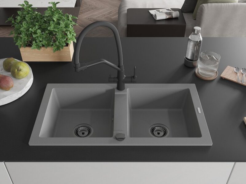 Technické dáta: drez: Rozmer: 820 x 436 x 161 mm Hĺbka komory: 151 mm Rozmery komory: 356×336 mm Priemer odtoku: ø90 mm Typ: 2-komorový Typ: Zapustené do pracovnej dosky Šedá farba Povrchová úprava sifónu: čierna Materiál: žula (80% žulové kamenivo, 20% živice) Prepadový otvor: Áno Otvory: (batérie, automatické) 2 Vysoká odolnosť proti poškriabaniu a zmene farby Odolnosť proti tepelným šokom Ľahko čistiteľný povrch kuchynská batéria: Materiál: mosadz Čierna farba Hlavy: Keramické Prevzdušňovač: Áno Typ hubica: Flexibilný s mosadzným držiakom Rozsah výtoku: 260 mm Výška: 405 mm Typ: Dve rukoväte Dvojhlavá batéria s prídavným filtrom na pitnú vodu(GT) Ean: 5905315046598
