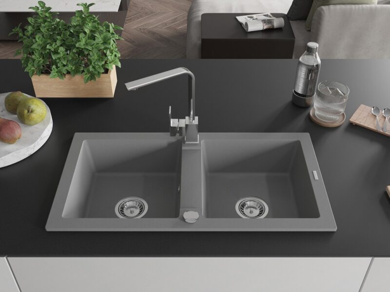 Technické dáta: drez: Rozmer: 820 x 436 x 161 mm Hĺbka komory: 151 mm Rozmery komory: 356×336 mm Priemer odtoku: ø90 mm Typ: 2-komorový Typ: Zapustené do pracovnej dosky Šedá farba Povrchová úprava sifónu: Chrome Materiál: žula (80% žulové kamenivo, 20% živice) Prepadový otvor: Áno Otvory: (batérie, automatické) 2 Vysoká odolnosť proti poškriabaniu a zmene farby Odolnosť proti tepelným šokom Ľahko čistiteľný povrch kuchynská batéria: Materiál: mosadz Farba: Chrome Hlava: Keramická Prevzdušňovač: Áno Typ: Jedna páka Výška batérie: 290 mm Rozsah výtoku: 220 mm(GT) Ean: 5905315017932