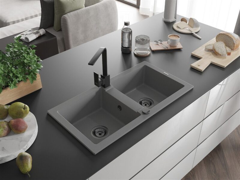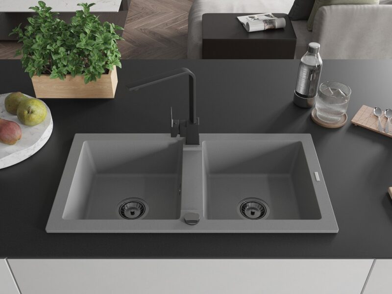 Technické dáta: drez: Rozmer: 820 x 436 x 161 mm Hĺbka komory: 151 mm Rozmery komory: 356×336 mm Priemer odtoku: ø90 mm Typ: 2-komorový Typ: Zapustené do pracovnej dosky Šedá farba Povrchová úprava sifónu: čierna Materiál: žula (80% žulové kamenivo, 20% živice) Prepadový otvor: Áno Otvory: (batérie, automatické) 2 Vysoká odolnosť proti poškriabaniu a zmene farby Odolnosť proti tepelným šokom Ľahko čistiteľný povrch kuchynská batéria: Materiál: mosadz Čierna farba Hlava: Keramická Prevzdušňovač: Áno Typ: Jedna páka Výška batérie: 290 mm Rozsah výtoku: 220 mm(GT) Ean: 5905315017963