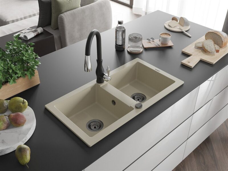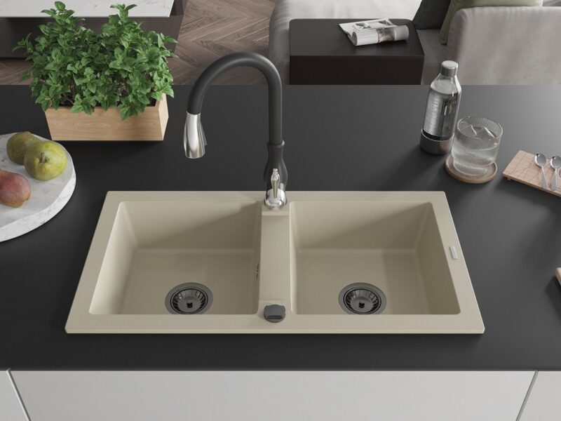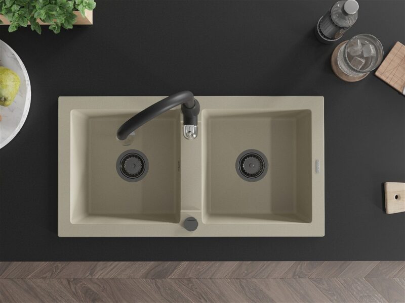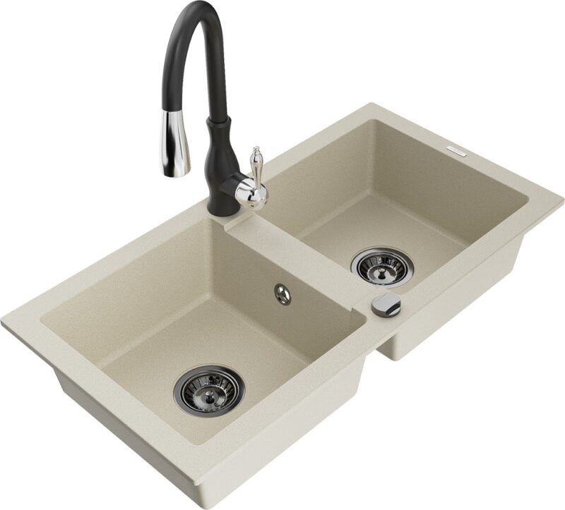 Technické dáta: drez: Rozmer: 820 x 436 x 161 mm Hĺbka komory: 151 mm Rozmery komory: 356×336 mm Priemer odtoku: ø90 mm Typ: 2-komorový Typ: Zapustené do pracovnej dosky Farba béžová Povrchová úprava sifónu: čierna Materiál: žula (80% žulové kamenivo, 20% živice) Prepadový otvor: Áno Otvory: (batérie, automatické) 2 Vysoká odolnosť proti poškriabaniu a zmene farby Odolnosť proti tepelným šokom Ľahko čistiteľný povrch kuchynská batéria: Materiál: mosadz Čierna farba Hlava: Keramická Prevzdušňovač: Áno Typ: Jedna páka Výška batérie: 410 mm Rozsah výtoku: 231 mm(GT) Ean: 5905315033284