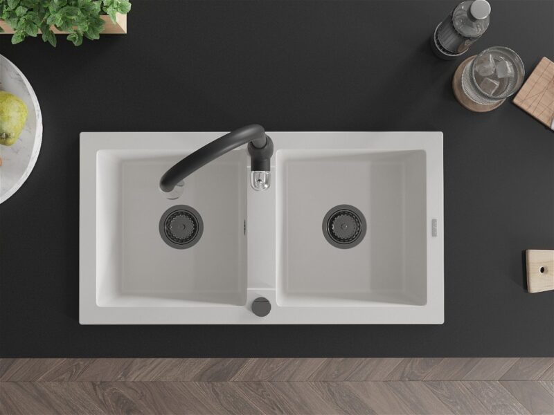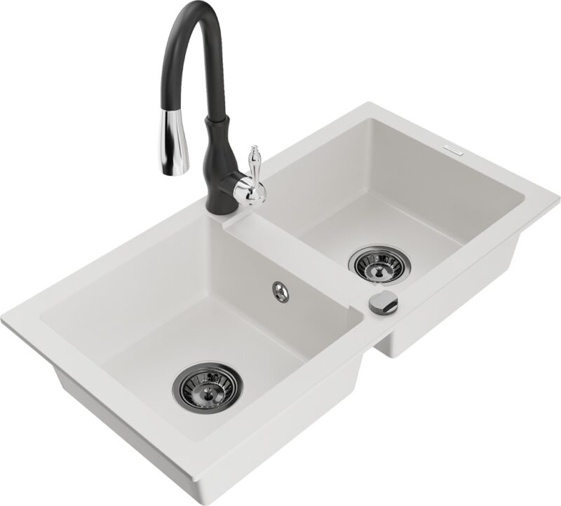 Technické dáta: drez: Rozmer: 820 x 436 x 161 mm Hĺbka komory: 151 mm Rozmery komory: 356×336 mm Priemer odtoku: ø90 mm Typ: 2-komorový Typ: Zapustené do pracovnej dosky biela farba Povrchová úprava sifónu: čierna Materiál: žula (80% žulové kamenivo, 20% živice) Prepadový otvor: Áno Otvory: (batérie, automatické) 2 Vysoká odolnosť proti poškriabaniu a zmene farby Odolnosť proti tepelným šokom Ľahko čistiteľný povrch kuchynská batéria: Materiál: mosadz Čierna farba Hlava: Keramická Prevzdušňovač: Áno Typ: Jedna páka Výška batérie: 410 mm Rozsah výtoku: 231 mm(GT) Ean: 5905315033246