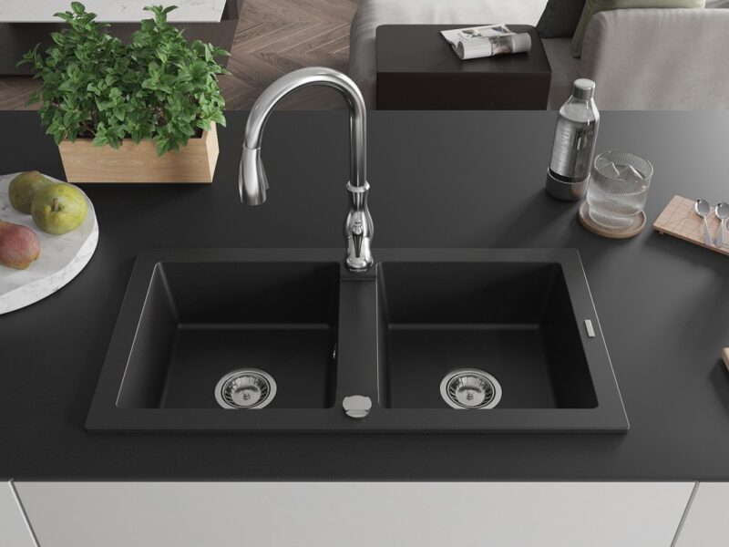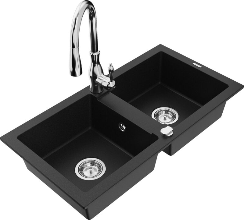 Technické dáta: drez: Rozmer: 820 x 436 x 161 mm Hĺbka komory: 151 mm Rozmery komory: 356×336 mm Priemer odtoku: ø90 mm Typ: 2-komorový Typ: Zapustené do pracovnej dosky Čierna farba Povrchová úprava sifónu: Chrome Materiál: žula (80% žulové kamenivo, 20% živice) Prepadový otvor: Áno Otvory: (batérie, automatické) 2 Vysoká odolnosť proti poškriabaniu a zmene farby Odolnosť proti tepelným šokom Ľahko čistiteľný povrch kuchynská batéria: Materiál: mosadz Farba: Chrome Hlava: Keramická Prevzdušňovač: Áno Typ: Jedna páka Výška batérie: 410 mm Rozsah výtoku: 231 mm(GT) Ean: 5905315033482