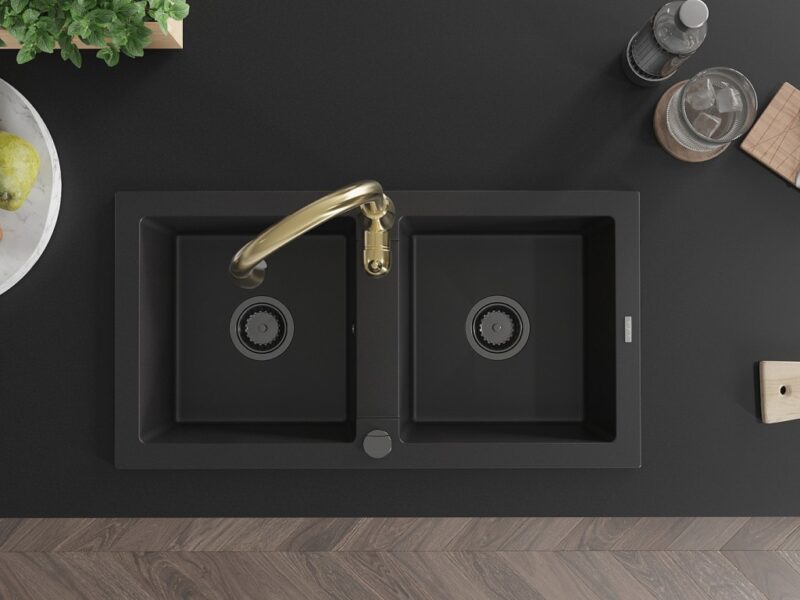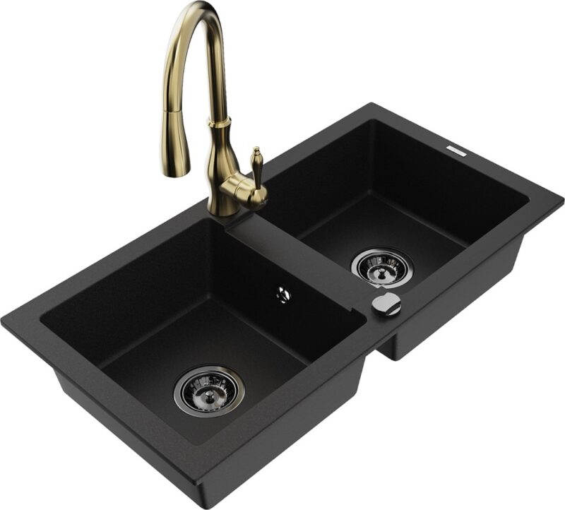 Technické dáta: drez: Rozmer: 820 x 436 x 161 mm Hĺbka komory: 151 mm Rozmery komory: 356×336 mm Priemer odtoku: ø90 mm Typ: 2-komorový Typ: Zapustené do pracovnej dosky Čierna farba Povrchová úprava sifónu: čierna Materiál: žula (80% žulové kamenivo, 20% živice) Prepadový otvor: Áno Otvory: (batérie, automatické) 2 Vysoká odolnosť proti poškriabaniu a zmene farby Odolnosť proti tepelným šokom Ľahko čistiteľný povrch kuchynská batéria: Materiál: mosadz Farba: Zlatá Hlava: Keramická Prevzdušňovač: Áno Typ: Jedna páka Výška batérie: 410 mm Rozsah výtoku: 231 mm(GT) Ean: 5905315033505