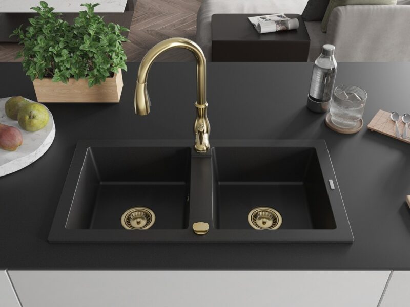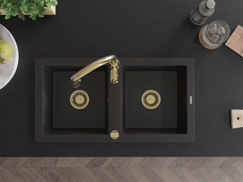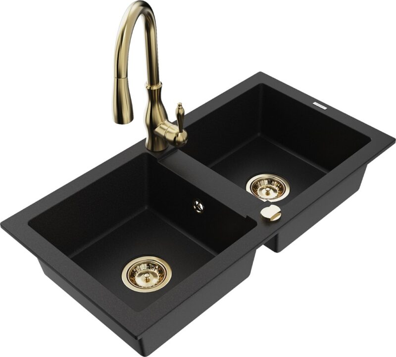 Technické dáta: drez: Rozmer: 820 x 436 x 161 mm Hĺbka komory: 151 mm Rozmery komory: 356×336 mm Priemer odtoku: ø90 mm Typ: 2-komorový Typ: Zapustené do pracovnej dosky Čierna farba Povrchová úprava sifónu: zlatá Materiál: žula (80% žulové kamenivo, 20% živice) Prepadový otvor: Áno Otvory: (batérie, automatické) 2 Vysoká odolnosť proti poškriabaniu a zmene farby Odolnosť proti tepelným šokom Ľahko čistiteľný povrch kuchynská batéria: Materiál: mosadz Farba: Zlatá Hlava: Keramická Prevzdušňovač: Áno Typ: Jedna páka Výška batérie: 410 mm Rozsah výtoku: 231 mm(GT) Ean: 5905315033499
