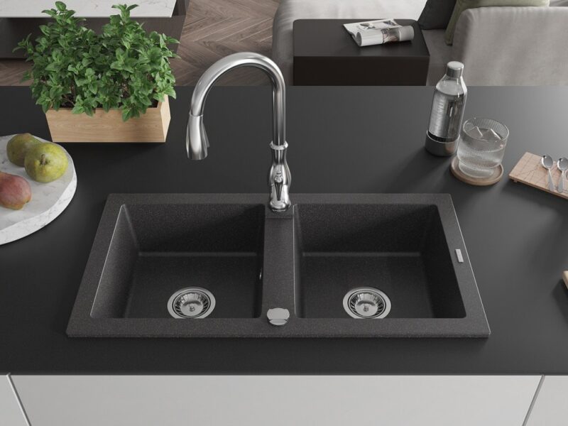 Technické dáta: drez: Rozmer: 820 x 436 x 161 mm Hĺbka komory: 151 mm Rozmery komory: 356×336 mm Priemer odtoku: ø90 mm Typ: 2-komorový Typ: Zapustené do pracovnej dosky Farba: Škvrnitá čierna Povrchová úprava sifónu: Chrome Materiál: žula (80% žulové kamenivo, 20% živice) Prepadový otvor: Áno Otvory: (batérie, automatické) 2 Vysoká odolnosť proti poškriabaniu a zmene farby Odolnosť proti tepelným šokom Ľahko čistiteľný povrch kuchynská batéria: Materiál: mosadz Farba: Chrome Hlava: Keramická Prevzdušňovač: Áno Typ: Jedna páka Výška batérie: 410 mm Rozsah výtoku: 231 mm(GT) Ean: 5905315033437