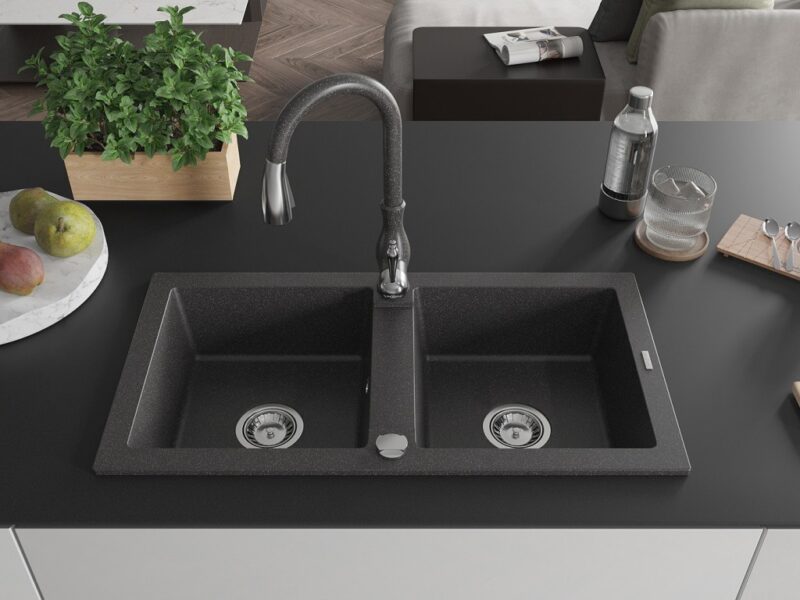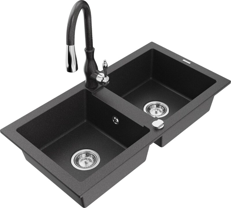 Technické dáta: drez: Rozmer: 820 x 436 x 161 mm Hĺbka komory: 151 mm Rozmery komory: 356×336 mm Priemer odtoku: ø90 mm Typ: 2-komorový Typ: Zapustené do pracovnej dosky Farba: Škvrnitá čierna Povrchová úprava sifónu: Chrome Materiál: žula (80% žulové kamenivo, 20% živice) Prepadový otvor: Áno Otvory: (batérie, automatické) 2 Vysoká odolnosť proti poškriabaniu a zmene farby Odolnosť proti tepelným šokom Ľahko čistiteľný povrch kuchynská batéria: Materiál: mosadz Farba: Škvrnitá čierna Hlava: Keramická Prevzdušňovač: Áno Typ: Jedna páka Výška batérie: 410 mm Rozsah výtoku: 231 mm(GT) Ean: 5905315033475