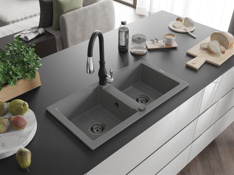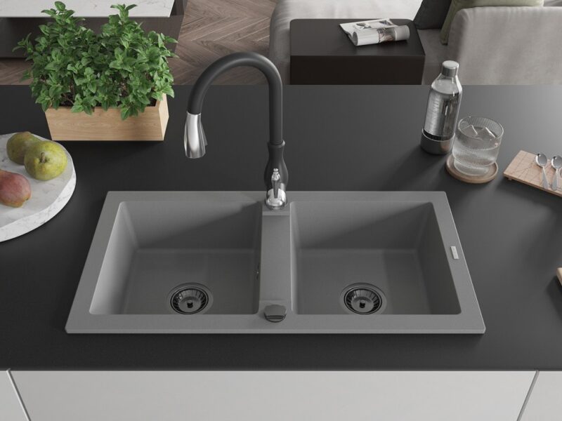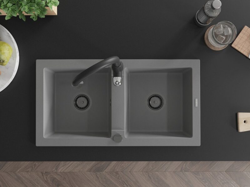 Technické dáta: drez: Rozmer: 820 x 436 x 161 mm Hĺbka komory: 151 mm Rozmery komory: 356×336 mm Priemer odtoku: ø90 mm Typ: 2-komorový Typ: Zapustené do pracovnej dosky Šedá farba Povrchová úprava sifónu: čierna Materiál: žula (80% žulové kamenivo, 20% živice) Prepadový otvor: Áno Otvory: (batérie, automatické) 2 Vysoká odolnosť proti poškriabaniu a zmene farby Odolnosť proti tepelným šokom Ľahko čistiteľný povrch kuchynská batéria: Materiál: mosadz Čierna farba Hlava: Keramická Prevzdušňovač: Áno Typ: Jedna páka Výška batérie: 410 mm Rozsah výtoku: 231 mm(GT) Ean: 5905315033321