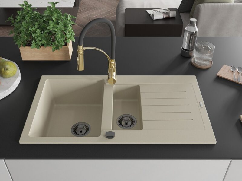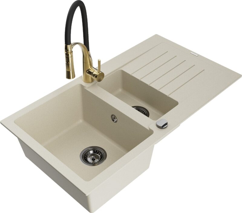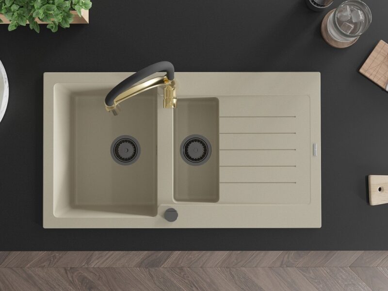 Technické dáta: drez: Rozmer: 900x505x200mm Hĺbka komory: 180 mm (väčšia), 115 mm (menšia) Rozmery komory: 435×335 mm (väčšie), 345×150 mm (menšie) Priemer odtoku: ø90 mm Typ: 1,5-komorový s krátkym odkvapkávačom Typ: Zapustené do pracovnej dosky Farba béžová Povrchová úprava sifónu: čierna Materiál: žula (80% žulové kamenivo, 20% živice) Prepadový otvor: Áno Otvory: (batérie, automatické) 2 Inštalácia: Univerzálna, je možné inštalovať s odkvapkávačom na ľavú alebo pravú stranu Vysoká odolnosť proti poškriabaniu a zmene farby Odolnosť proti tepelným šokom Ľahko čistiteľný povrch Dva dodatočné vyfrézované otvory na samodierovanie ø35 kuchynská batéria: Materiál: mosadz Farba: Zlatá/Čierna Hlava: Keramická Prevzdušňovač: Áno Typ: Jedna páka Výška batérie: 430 mm Rozsah výtoku: 185 mm Batéria má výsuvný výtok(GT) Ean: 5905315043030
