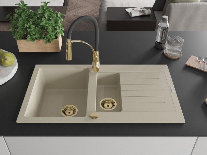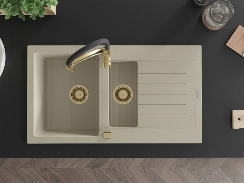 Technické dáta: drez: Rozmer: 900x505x200mm Hĺbka komory: 180 mm (väčšia), 115 mm (menšia) Rozmery komory: 435×335 mm (väčšie), 345×150 mm (menšie) Priemer odtoku: ø90 mm Typ: 1,5-komorový s krátkym odkvapkávačom Typ: Zapustené do pracovnej dosky Farba béžová Povrchová úprava sifónu: zlatá Materiál: žula (80% žulové kamenivo, 20% živice) Prepadový otvor: Áno Otvory: (batérie, automatické) 2 Inštalácia: Univerzálna, je možné inštalovať s odkvapkávačom na ľavú alebo pravú stranu Vysoká odolnosť proti poškriabaniu a zmene farby Odolnosť proti tepelným šokom Ľahko čistiteľný povrch Dva dodatočné vyfrézované otvory na samodierovanie ø35 kuchynská batéria: Materiál: mosadz Farba: Zlatá/Čierna Hlava: Keramická Prevzdušňovač: Áno Typ: Jedna páka Výška batérie: 430 mm Rozsah výtoku: 185 mm Batéria má výsuvný výtok(GT) Ean: 5905315043023