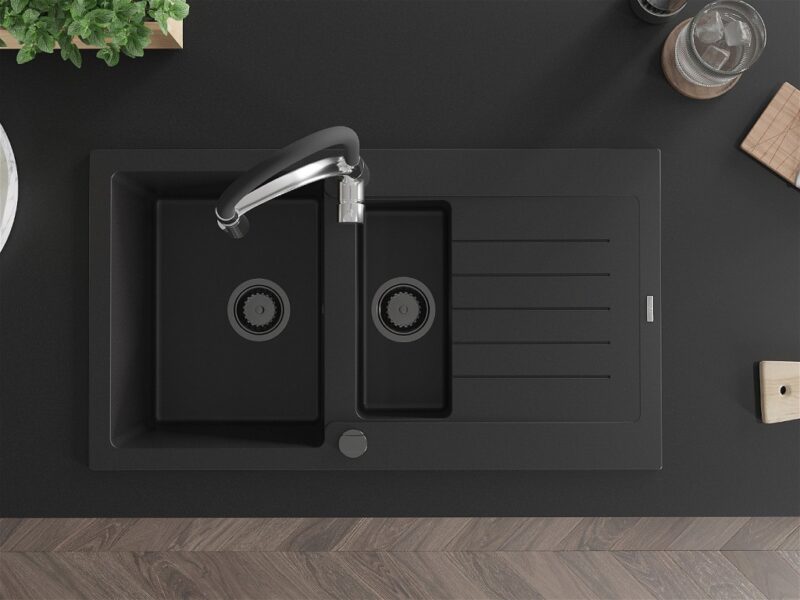 Technické dáta: drez: Rozmer: 900x505x200mm Hĺbka komory: 180 mm (väčšia), 115 mm (menšia) Rozmery komory: 435×335 mm (väčšie), 345×150 mm (menšie) Priemer odtoku: ø90 mm Typ: 1,5-komorový s krátkym odkvapkávačom Typ: Zapustené do pracovnej dosky Čierna farba Povrchová úprava sifónu: čierna Materiál: žula (80% žulové kamenivo, 20% živice) Prepadový otvor: Áno Otvory: (batérie, automatické) 2 Inštalácia: Univerzálna, je možné inštalovať s odkvapkávačom na ľavú alebo pravú stranu Vysoká odolnosť proti poškriabaniu a zmene farby Odolnosť proti tepelným šokom Ľahko čistiteľný povrch Dva dodatočné vyfrézované otvory na samodierovanie ø35 kuchynská batéria: Materiál: mosadz Farba: chróm/čierna Hlava: Keramická Prevzdušňovač: Áno Typ: Jedna páka Výška batérie: 430 mm Rozsah výtoku: 185 mm Batéria má výsuvný výtok(GT) Ean: 5905315043313