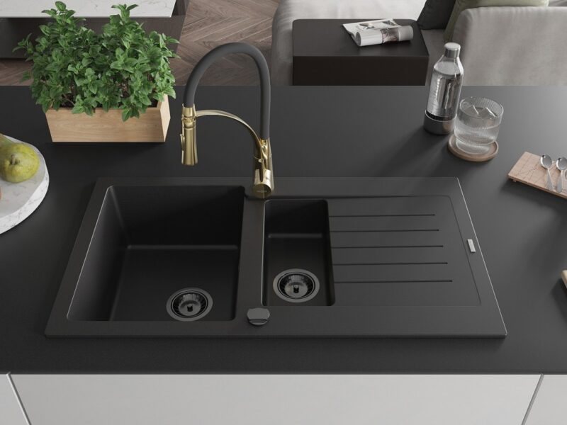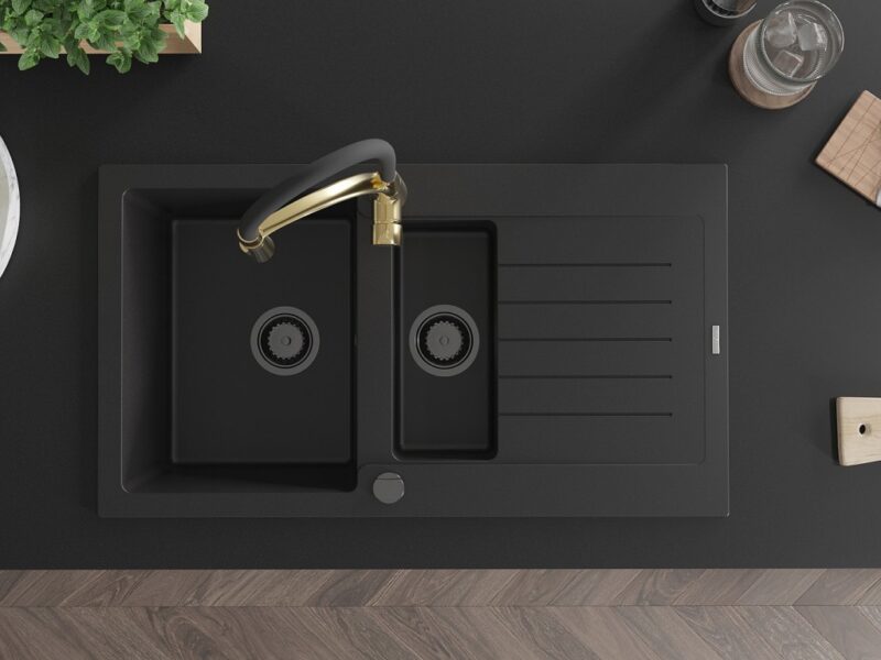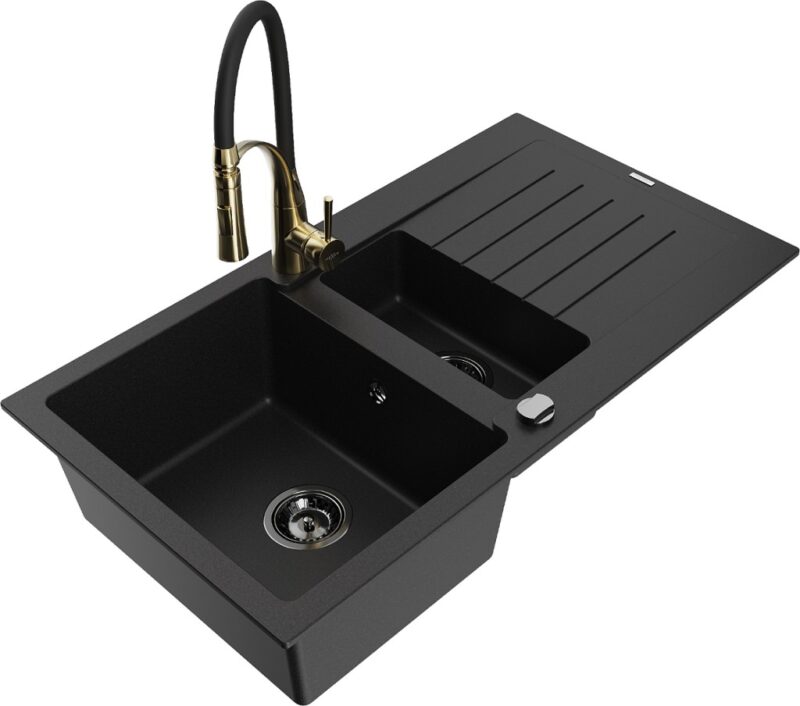 Technické dáta: drez: Rozmer: 900x505x200mm Hĺbka komory: 180 mm (väčšia), 115 mm (menšia) Rozmery komory: 435×335 mm (väčšie), 345×150 mm (menšie) Priemer odtoku: ø90 mm Typ: 1,5-komorový s krátkym odkvapkávačom Typ: Zapustené do pracovnej dosky Čierna farba Povrchová úprava sifónu: čierna Materiál: žula (80% žulové kamenivo, 20% živice) Prepadový otvor: Áno Otvory: (batérie, automatické) 2 Inštalácia: Univerzálna, je možné inštalovať s odkvapkávačom na ľavú alebo pravú stranu Vysoká odolnosť proti poškriabaniu a zmene farby Odolnosť proti tepelným šokom Ľahko čistiteľný povrch Dva dodatočné vyfrézované otvory na samodierovanie ø35 kuchynská batéria: Materiál: mosadz Farba: Zlatá/Čierna Hlava: Keramická Prevzdušňovač: Áno Typ: Jedna páka Výška batérie: 430 mm Rozsah výtoku: 185 mm Batéria má výsuvný výtok(GT) Ean: 5905315043337