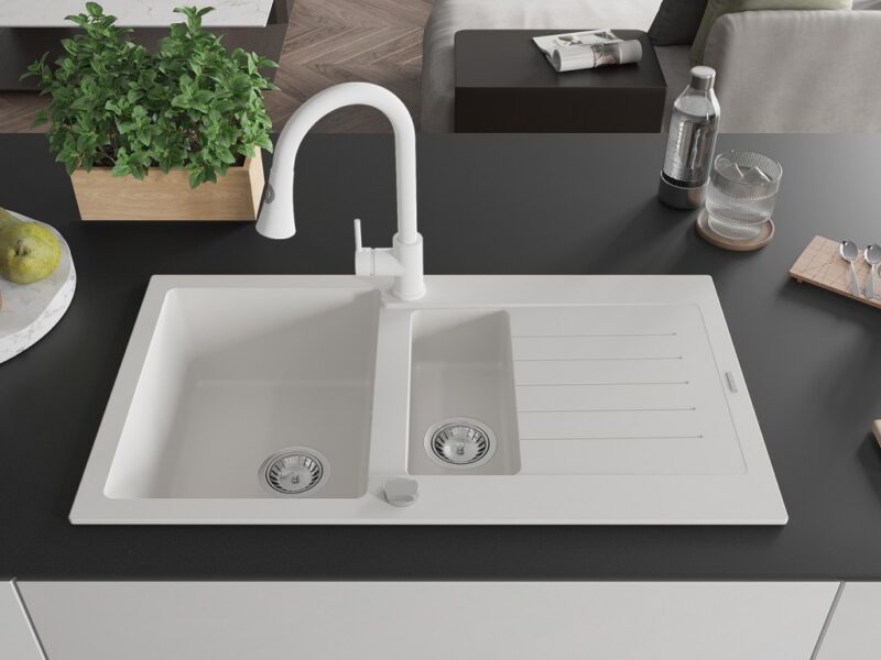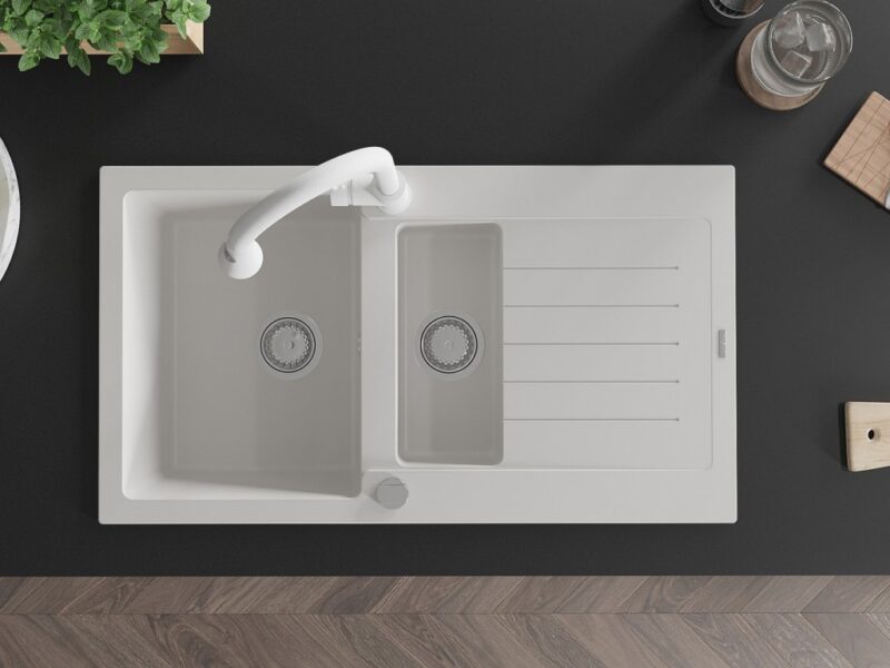 Technické dáta: drez: Rozmer: 900x505x200mm Hĺbka komory: 180 mm (väčšia), 115 mm (menšia) Rozmery komory: 435×335 mm (väčšie), 345×150 mm (menšie) Priemer odtoku: ø90 mm Typ: 1,5-miska s krátkym odkvapkávačom Typ: Zapustené do pracovnej dosky biela farba Povrchová úprava sifónu: Chrome Materiál: žula (80% žulové kamenivo, 20% živice) Prepadový otvor: Áno Otvory: (batérie, automatické) 2 Inštalácia: Univerzálna, je možné inštalovať s odkvapkávačom na ľavú alebo pravú stranu Vysoká odolnosť proti poškriabaniu a zmene farby Odolnosť proti tepelným šokom Ľahko čistiteľný povrch Dva dodatočné vyfrézované otvory na samodierovanie ø35 kuchynská batéria: Materiál: mosadz biela farba Hlava: Keramická Prevzdušňovač: Áno Typ: Jedna páka Výška batérie: 380 mm Rozsah výtoku: 252 mm Typ výtoku: Výsuvný(GT) Ean: 5905315027450