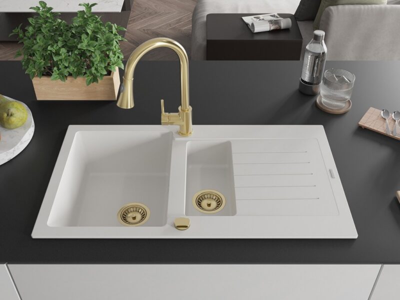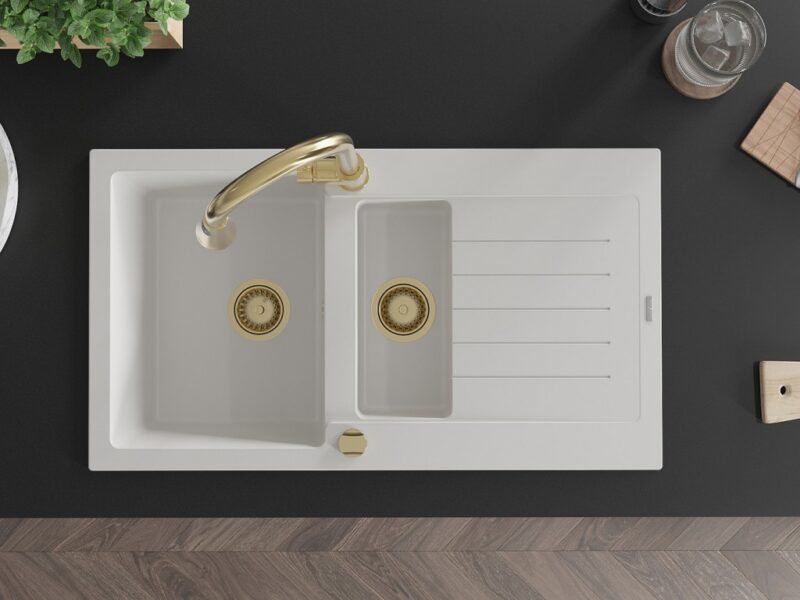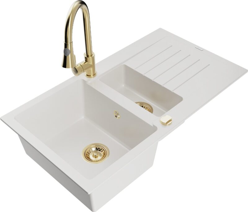 Technické dáta: drez: Rozmer: 900x505x200mm Hĺbka komory: 180 mm (väčšia), 115 mm (menšia) Rozmery komory: 435×335 mm (väčšie), 345×150 mm (menšie) Priemer odtoku: ø90 mm Typ: 1,5-miska s krátkym odkvapkávačom Typ: Zapustené do pracovnej dosky biela farba Povrchová úprava sifónu: zlatá Materiál: žula (80% žulové kamenivo, 20% živice) Prepadový otvor: Áno Otvory: (batérie, automatické) 2 Inštalácia: Univerzálna, je možné inštalovať s odkvapkávačom na ľavú alebo pravú stranu Vysoká odolnosť proti poškriabaniu a zmene farby Odolnosť proti tepelným šokom Ľahko čistiteľný povrch Dva dodatočné vyfrézované otvory na samodierovanie ø35 kuchynská batéria: Materiál: mosadz Farba: Zlatá Hlava: Keramická Prevzdušňovač: Áno Typ: Jedna páka Výška batérie: 380 mm Rozsah výtoku: 252 mm Typ výtoku: Výsuvný(GT) Ean: 5905315027467