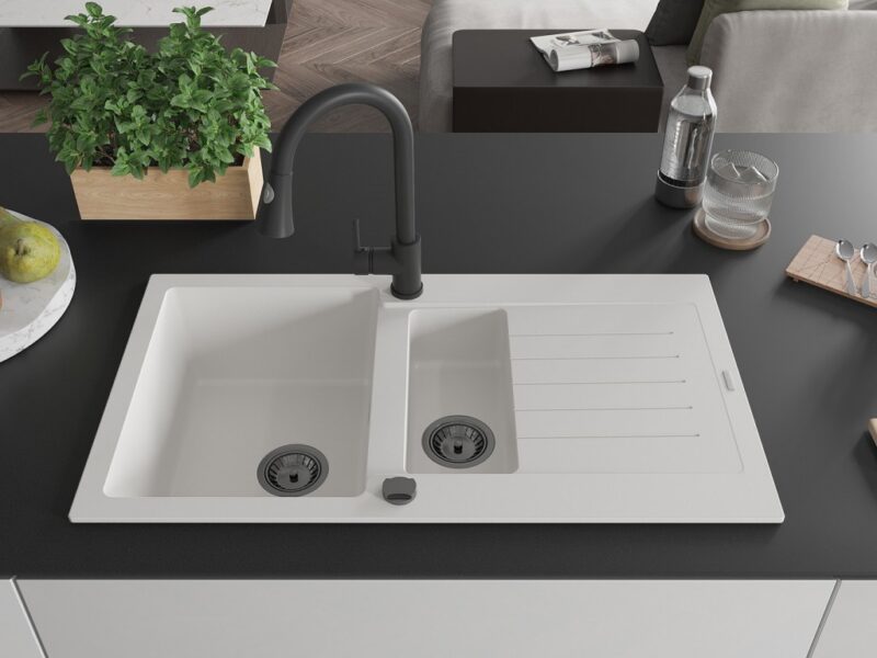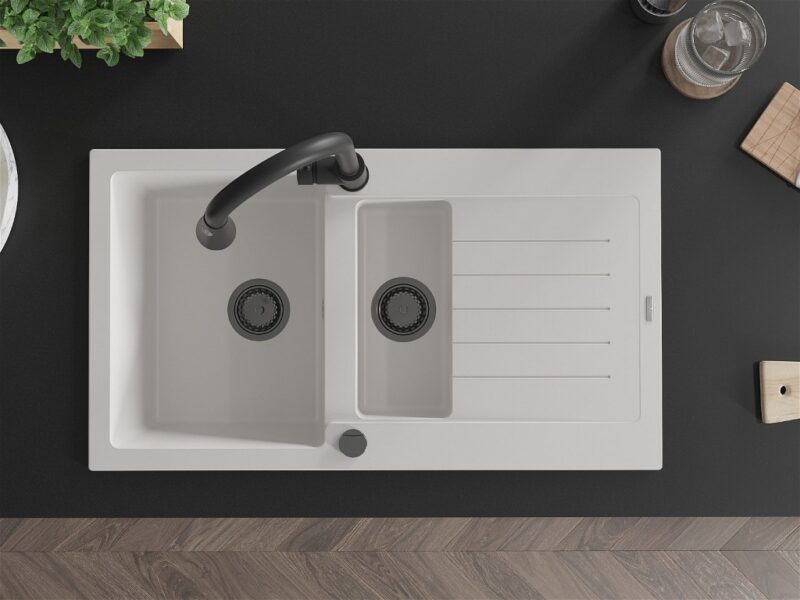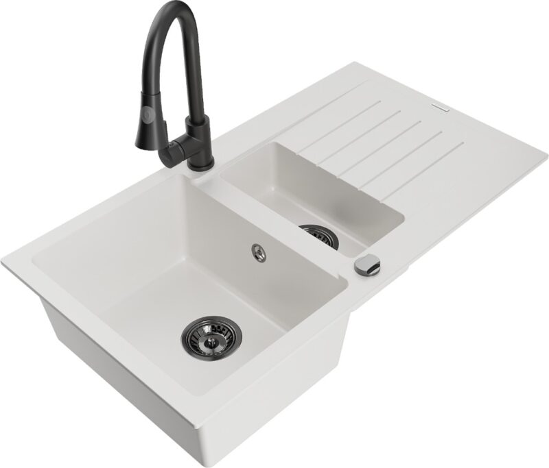 Technické dáta: drez: Rozmer: 900x505x200mm Hĺbka komory: 180 mm (väčšia), 115 mm (menšia) Rozmery komory: 435×335 mm (väčšie), 345×150 mm (menšie) Priemer odtoku: ø90 mm Typ: 1,5-miska s krátkym odkvapkávačom Typ: Zapustené do pracovnej dosky biela farba Povrchová úprava sifónu: čierna Materiál: žula (80% žulové kamenivo, 20% živice) Prepadový otvor: Áno Otvory: (batérie, automatické) 2 Inštalácia: Univerzálna, je možné inštalovať s odkvapkávačom na ľavú alebo pravú stranu Vysoká odolnosť proti poškriabaniu a zmene farby Odolnosť proti tepelným šokom Ľahko čistiteľný povrch Dva dodatočné vyfrézované otvory na samodierovanie ø35 kuchynská batéria: Materiál: mosadz Čierna farba Hlava: Keramická Prevzdušňovač: Áno Typ: Jedna páka Výška batérie: 380 mm Rozsah výtoku: 252 mm Typ výtoku: Výsuvný(GT) Ean: 5905315027474