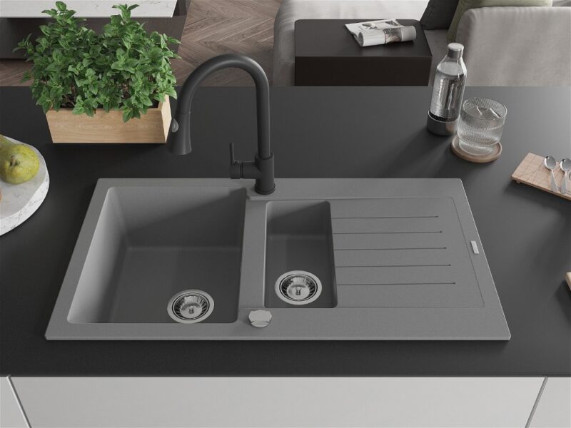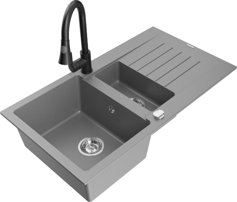 Technické dáta: drez: Rozmer: 900x505x200mm Hĺbka komory: 180 mm (väčšia), 115 mm (menšia) Rozmery komory: 435×335 mm (väčšie), 345×150 mm (menšie) Priemer odtoku: ø90 mm Typ: 1,5-miska s krátkym odkvapkávačom Typ: Zapustené do pracovnej dosky Šedá farba Povrchová úprava sifónu: Chrome Materiál: žula (80% žulové kamenivo, 20% živice) Prepadový otvor: Áno Otvory: (batérie, automatické) 2 Inštalácia: Univerzálna, je možné inštalovať s odkvapkávačom na ľavú alebo pravú stranu Vysoká odolnosť proti poškriabaniu a zmene farby Odolnosť proti tepelným šokom Ľahko čistiteľný povrch Dva dodatočné vyfrézované otvory na samodierovanie ø35 kuchynská batéria: Materiál: mosadz Čierna farba Hlava: Keramická Prevzdušňovač: Áno Typ: Jedna páka Výška batérie: 380 mm Rozsah výtoku: 252 mm Typ výtoku: Výsuvný(GT) Ean: 5905315027542