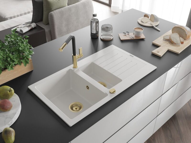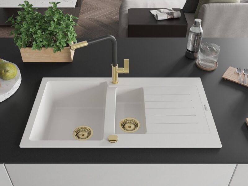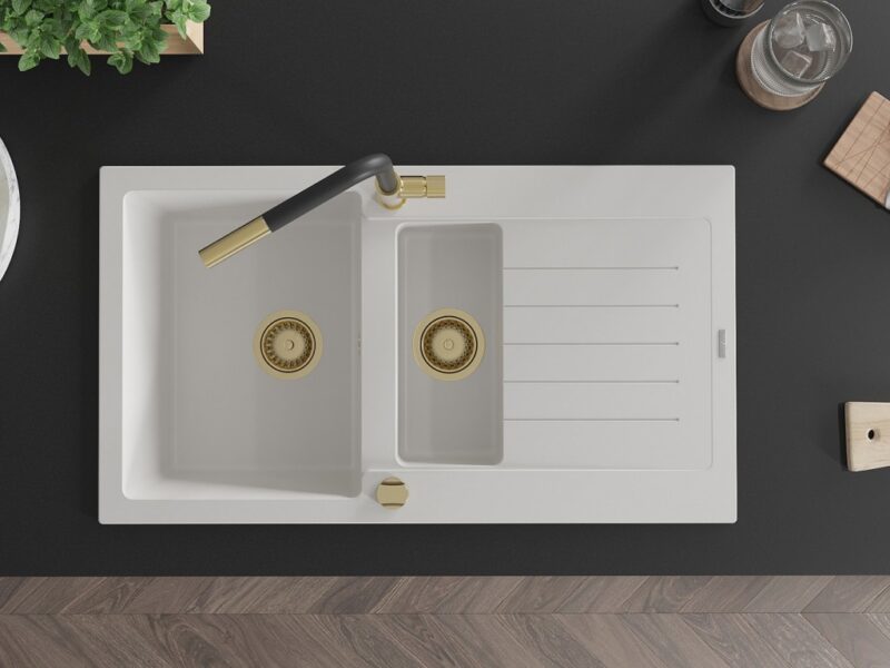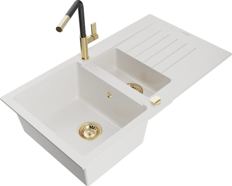 Technické dáta: drez: Rozmer: 900x505x200mm Hĺbka komory: 180 mm (väčšia), 115 mm (menšia) Rozmery komory: 435×335 mm (väčšie), 345×150 mm (menšie) Priemer odtoku: ø90 mm Typ: 1,5-komorový s krátkym odkvapkávačom Typ: Zapustené do pracovnej dosky biela farba Povrchová úprava sifónu: zlatá Materiál: žula (80% žulové kamenivo, 20% živice) Prepadový otvor: Áno Otvory: (batérie, automatické) 2 Inštalácia: Univerzálna, je možné inštalovať s odkvapkávačom na ľavú alebo pravú stranu Vysoká odolnosť proti poškriabaniu a zmene farby Odolnosť proti tepelným šokom Ľahko čistiteľný povrch Dva dodatočné vyfrézované otvory na samodierovanie ø35 kuchynská batéria: Materiál: mosadz Farba: Zlatá/Čierna Hlava: Keramická Prevzdušňovač: Áno Typ: Jedna páka Rozsah výtoku: 245 mm Výška batérie: 307 mm(GT) Ean: 5905315056504
