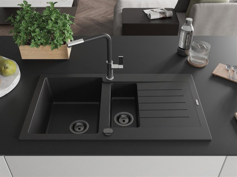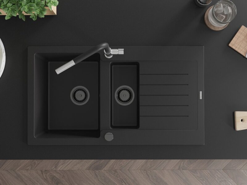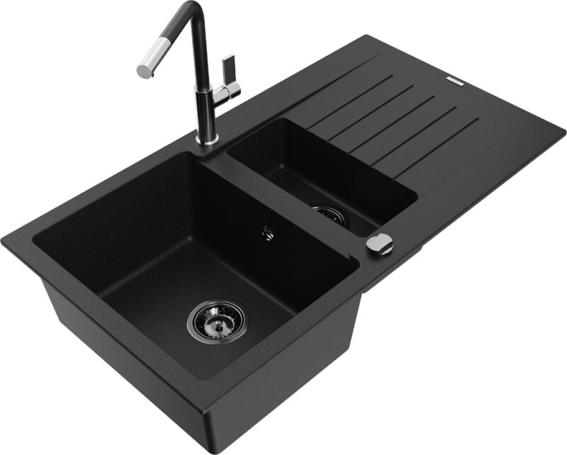 Technické dáta: drez: Rozmer: 900x505x200mm Hĺbka komory: 180 mm (väčšia), 115 mm (menšia) Rozmery komory: 435×335 mm (väčšie), 345×150 mm (menšie) Priemer odtoku: ø90 mm Typ: 1,5-komorový s krátkym odkvapkávačom Typ: Zapustené do pracovnej dosky Čierna farba Povrchová úprava sifónu: čierna Materiál: žula (80% žulové kamenivo, 20% živice) Prepadový otvor: Áno Otvory: (batérie, automatické) 2 Inštalácia: Univerzálna, je možné inštalovať s odkvapkávačom na ľavú alebo pravú stranu Vysoká odolnosť proti poškriabaniu a zmene farby Odolnosť proti tepelným šokom Ľahko čistiteľný povrch Dva dodatočné vyfrézované otvory na samodierovanie ø35 kuchynská batéria: Materiál: mosadz Farba: chróm/čierna Hlava: Keramická Prevzdušňovač: Áno Typ: Jedna páka Rozsah výtoku: 245 mm Výška batérie: 307 mm(GT) Ean: 5905315056917
