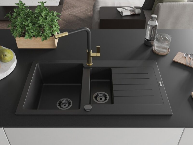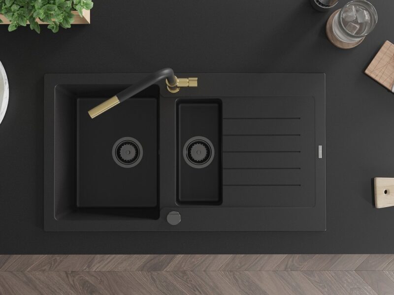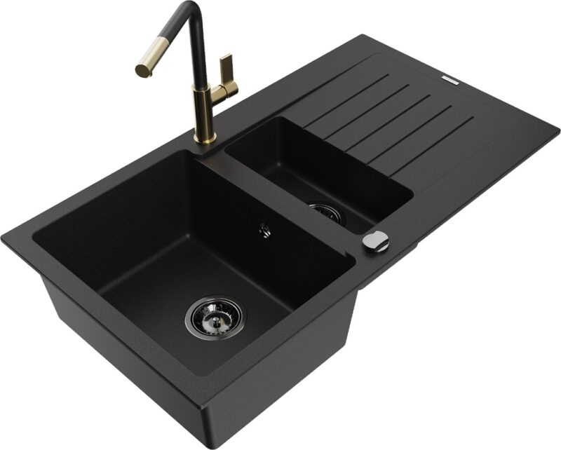 Technické dáta: drez: Rozmer: 900x505x200mm Hĺbka komory: 180 mm (väčšia), 115 mm (menšia) Rozmery komory: 435×335 mm (väčšie), 345×150 mm (menšie) Priemer odtoku: ø90 mm Typ: 1,5-komorový s krátkym odkvapkávačom Typ: Zapustené do pracovnej dosky Čierna farba Povrchová úprava sifónu: čierna Materiál: žula (80% žulové kamenivo, 20% živice) Prepadový otvor: Áno Otvory: (batérie, automatické) 2 Inštalácia: Univerzálna, je možné inštalovať s odkvapkávačom na ľavú alebo pravú stranu Vysoká odolnosť proti poškriabaniu a zmene farby Odolnosť proti tepelným šokom Ľahko čistiteľný povrch Dva dodatočné vyfrézované otvory na samodierovanie ø35 kuchynská batéria: Materiál: mosadz Farba: Zlatá/Čierna Hlava: Keramická Prevzdušňovač: Áno Typ: Jedna páka Rozsah výtoku: 245 mm Výška batérie: 307 mm(GT) Ean: 5905315056931
