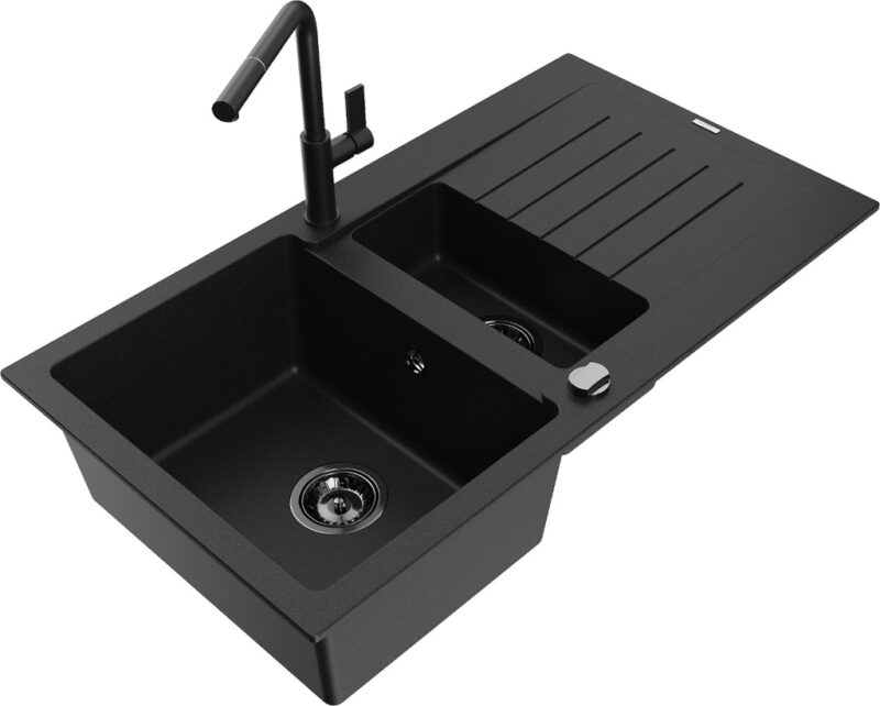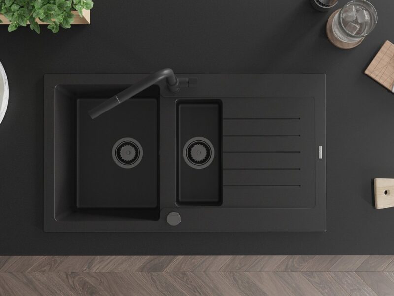 Technické dáta: drez: Rozmer: 900x505x200mm Hĺbka komory: 180 mm (väčšia), 115 mm (menšia) Rozmery komory: 435×335 mm (väčšie), 345×150 mm (menšie) Priemer odtoku: ø90 mm Typ: 1,5-komorový s krátkym odkvapkávačom Typ: Zapustené do pracovnej dosky Čierna farba Povrchová úprava sifónu: čierna Materiál: žula (80% žulové kamenivo, 20% živice) Prepadový otvor: Áno Otvory: (batérie, automatické) 2 Inštalácia: Univerzálna, je možné inštalovať s odkvapkávačom na ľavú alebo pravú stranu Vysoká odolnosť proti poškriabaniu a zmene farby Odolnosť proti tepelným šokom Ľahko čistiteľný povrch Dva dodatočné vyfrézované otvory na samodierovanie ø35 kuchynská batéria: Materiál: mosadz Čierna farba Hlava: Keramická Prevzdušňovač: Áno Typ: Jedna páka Rozsah výtoku: 245 mm Výška batérie: 307 mm(GT) Ean: 5905315056948