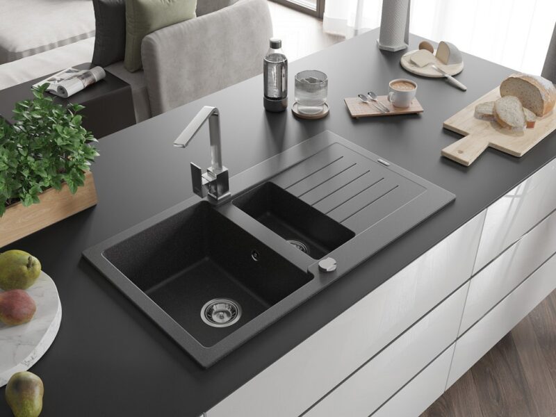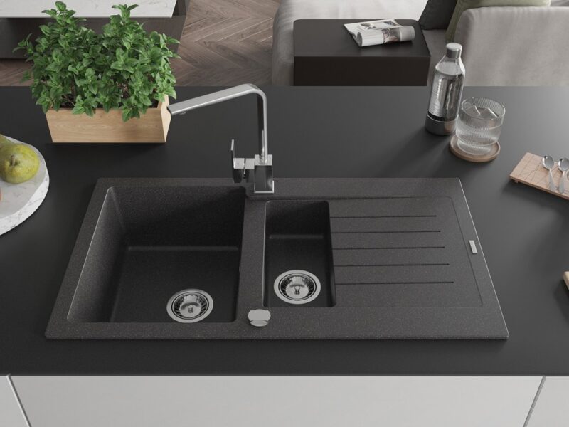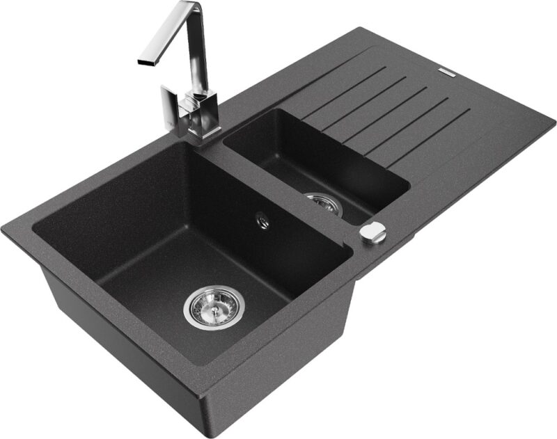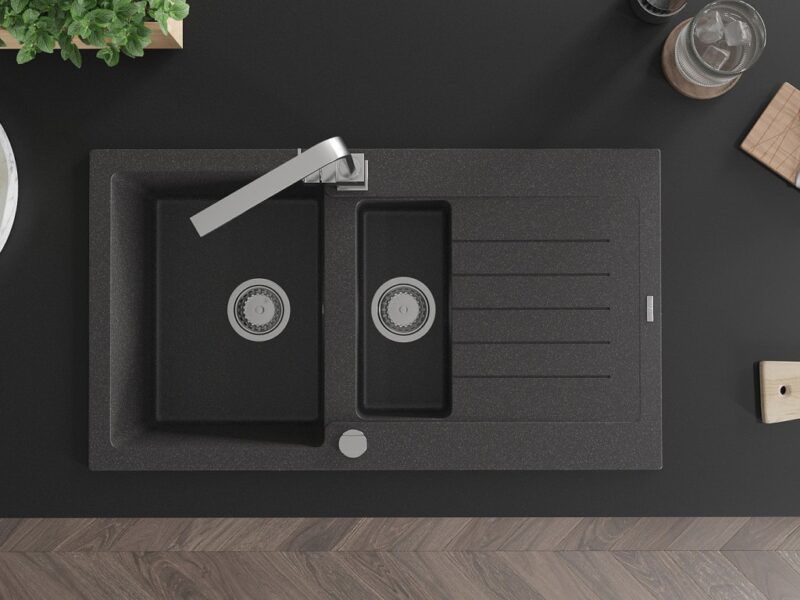 Technické dáta: drez: Rozmer: 900x505x200mm Hĺbka komory: 180 mm (väčšia), 115 mm (menšia) Rozmery komory: 435×335 mm (väčšie), 345×150 mm (menšie) Priemer odtoku: ø90 mm Typ: 1,5-komorový s krátkym odkvapkávačom Typ: Zapustené do pracovnej dosky Farba: Škvrnitá čierna Povrchová úprava sifónu: Chrome Materiál: žula (80% žulové kamenivo, 20% živice) Prepadový otvor: Áno Otvory: (batérie, automatické) 2 Inštalácia: Univerzálna, je možné inštalovať s odkvapkávačom na ľavú alebo pravú stranu Vysoká odolnosť proti poškriabaniu a zmene farby Odolnosť proti tepelným šokom Ľahko čistiteľný povrch Dva dodatočné vyfrézované otvory na samodierovanie ø35 kuchynská batéria: Materiál: mosadz Farba: Chrome Hlava: Keramická Prevzdušňovač: Áno Typ: Jedna páka Výška batérie: 290 mm Rozsah výtoku: 220 mm(GT) Ean: 5905315017437