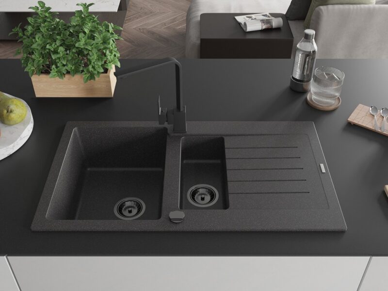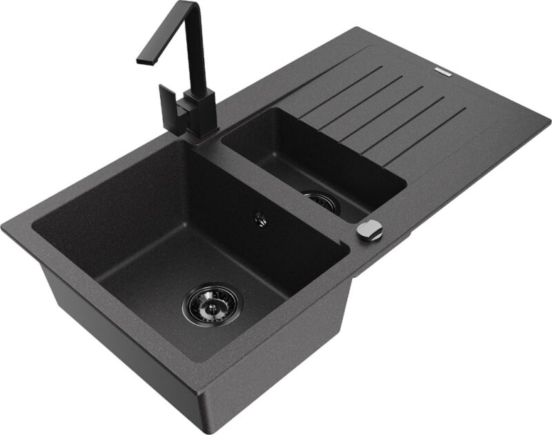 Technické dáta: drez: Rozmer: 900x505x200mm Hĺbka komory: 180 mm (väčšia), 115 mm (menšia) Rozmery komory: 435×335 mm (väčšie), 345×150 mm (menšie) Priemer odtoku: ø90 mm Typ: 1,5-komorový s krátkym odkvapkávačom Typ: Zapustené do pracovnej dosky Farba: Škvrnitá čierna Povrchová úprava sifónu: čierna Materiál: žula (80% žulové kamenivo, 20% živice) Prepadový otvor: Áno Otvory: (batérie, automatické) 2 Inštalácia: Univerzálna, je možné inštalovať s odkvapkávačom na ľavú alebo pravú stranu Vysoká odolnosť proti poškriabaniu a zmene farby Odolnosť proti tepelným šokom Ľahko čistiteľný povrch Dva dodatočné vyfrézované otvory na samodierovanie ø35 kuchynská batéria: Materiál: mosadz Čierna farba Hlava: Keramická Prevzdušňovač: Áno Typ: Jedna páka Výška batérie: 290 mm Rozsah výtoku: 220 mm(GT) Ean: 5905315017468