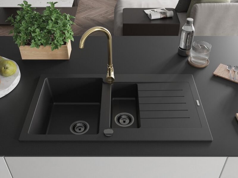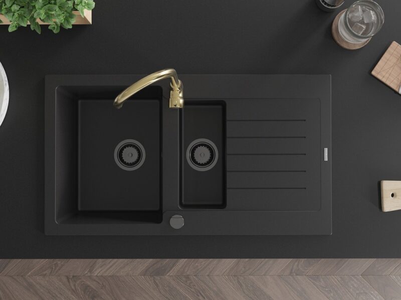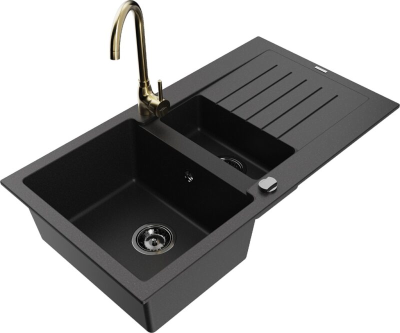 Technické dáta: drez: Rozmer: 900x505x200mm Hĺbka komory: 180 mm (väčšia), 115 mm (menšia) Rozmery komory: 435×335 mm (väčšie), 345×150 mm (menšie) Priemer odtoku: ø90 mm Typ: 1,5-komorový s krátkym odkvapkávačom Typ: Zapustené do pracovnej dosky Čierna farba Povrchová úprava sifónu: čierna Materiál: žula (80% žulové kamenivo, 20% živice) Prepadový otvor: Áno Otvory: (batérie, automatické) 2 Inštalácia: Univerzálna, je možné inštalovať s odkvapkávačom na ľavú alebo pravú stranu Vysoká odolnosť proti poškriabaniu a zmene farby Odolnosť proti tepelným šokom Ľahko čistiteľný povrch Dva dodatočné vyfrézované otvory na samodierovanie ø35 kuchynská batéria: Materiál: mosadz Farba: Zlatá Hlava: Keramická Prevzdušňovač: Áno Typ: Jedna páka Výška batérie: 335 mm Rozsah výtoku: 180 mm(GT) Ean: 5905315014047