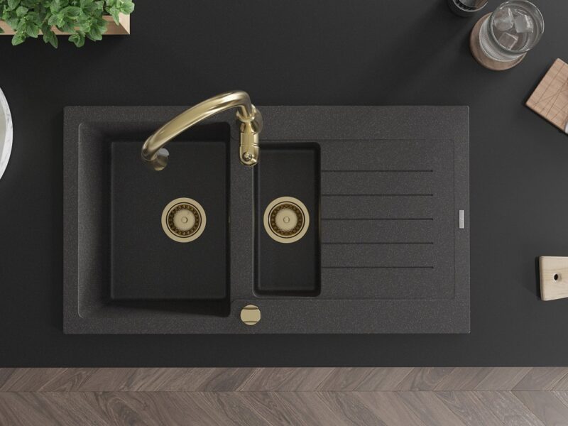 Technické dáta: drez: Rozmer: 900x505x200mm Hĺbka komory: 180 mm (väčšia), 115 mm (menšia) Rozmery komory: 435×335 mm (väčšie), 345×150 mm (menšie) Priemer odtoku: ø90 mm Typ: 1,5-komorový s krátkym odkvapkávačom Typ: Zapustené do pracovnej dosky Farba: Škvrnitá čierna Povrchová úprava sifónu: zlatá Materiál: žula (80% žulové kamenivo, 20% živice) Prepadový otvor: Áno Otvory: (batérie, automatické) 2 Inštalácia: Univerzálna, je možné inštalovať s odkvapkávačom na ľavú alebo pravú stranu Vysoká odolnosť proti poškriabaniu a zmene farby Odolnosť proti tepelným šokom Ľahko čistiteľný povrch Dva dodatočné vyfrézované otvory na samodierovanie ø35 kuchynská batéria: Materiál: mosadz Farba: Zlatá Hlava: Keramická Prevzdušňovač: Áno Výška batérie: 410 mm Rozsah výtoku: 231 mm(GT) Ean: 5905315032812