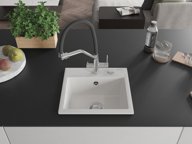 Technické dáta: drez: Rozmer: 435x410x171mm Hĺbka komory: 161 mm Rozmery komory: 375×280 mm Priemer odtoku: ø90 mm Typ: 1-komorový Typ: Zapustené do pracovnej dosky biela farba Povrchová úprava sifónu: Chrome Materiál: žula (80% žulové kamenivo, 20% živice) Prepadový otvor: Áno Otvory: (batérie, automatické) 2 Vysoká odolnosť proti poškriabaniu a zmene farby Odolnosť proti tepelným šokom Ľahko čistiteľný povrch Jeden dodatočný vyfrézovaný otvor na samodierovanie ø35 kuchynská batéria: Materiál: mosadz Farba: chróm/čierna Hlavy: Keramické Prevzdušňovač: Áno Typ hubica: Flexibilný s mosadzným držiakom Rozsah výtoku: 260 mm Výška: 405 mm Typ: Dve rukoväte Dvojhlavá batéria s prídavným filtrom na pitnú vodu(GT) Ean: 5905315048158