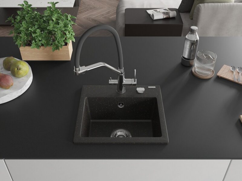 Technické dáta: drez: Rozmer: 435x410x171mm Hĺbka komory: 161 mm Rozmery komory: 375×280 mm Priemer odtoku: ø90 mm Typ: 1-komorový Typ: Zapustené do pracovnej dosky Farba: čierna / zlatá metalíza Povrchová úprava sifónu: Chrome Materiál: žula (80% žulové kamenivo, 20% živice) Prepadový otvor: Áno Otvory: (batérie, automatické) 2 Vysoká odolnosť proti poškriabaniu a zmene farby Odolnosť proti tepelným šokom Ľahko čistiteľný povrch Jeden dodatočný vyfrézovaný otvor na samodierovanie ø35 kuchynská batéria: Materiál: mosadz Farba: chróm/čierna Hlavy: Keramické Prevzdušňovač: Áno Typ hubica: Flexibilný s mosadzným držiakom Rozsah výtoku: 260 mm Výška: 405 mm Typ: Dve rukoväte Dvojhlavá batéria s prídavným filtrom na pitnú vodu(GT) Ean: 5905315049537