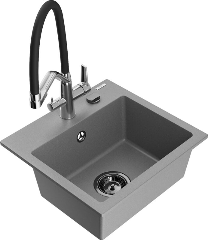 Technické dáta: drez: Rozmer: 435x410x171mm Hĺbka komory: 161 mm Rozmery komory: 375×280 mm Priemer odtoku: ø90 mm Typ: 1-komorový Typ: Zapustené do pracovnej dosky Šedá farba Povrchová úprava sifónu: čierna Materiál: žula (80% žulové kamenivo, 20% živice) Prepadový otvor: Áno Otvory: (batérie, automatické) 2 Vysoká odolnosť proti poškriabaniu a zmene farby Odolnosť proti tepelným šokom Ľahko čistiteľný povrch Jeden dodatočný vyfrézovaný otvor na samodierovanie ø35 kuchynská batéria: Materiál: mosadz Farba: chróm/čierna Hlavy: Keramické Prevzdušňovač: Áno Typ hubica: Flexibilný s mosadzným držiakom Rozsah výtoku: 260 mm Výška: 405 mm Typ: Dve rukoväte Dvojhlavá batéria s prídavným filtrom na pitnú vodu(GT) Ean: 5905315048936